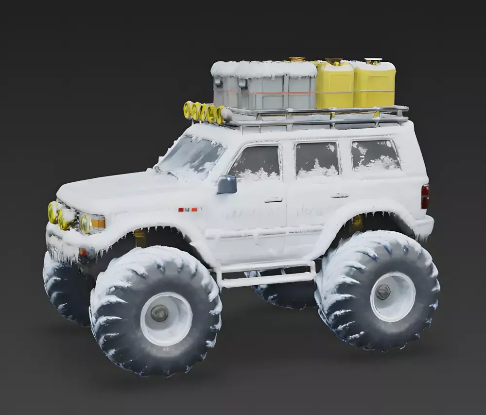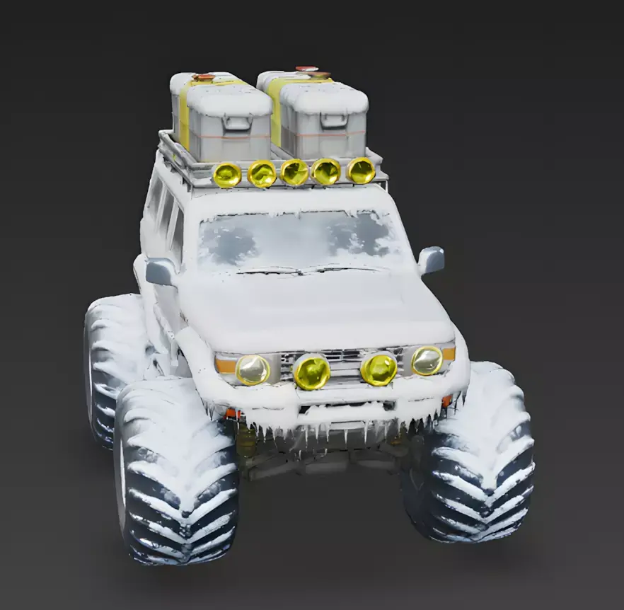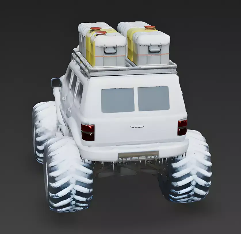 The Overall Concept This asset is a monster-truck style SUV designed for extreme polar exploration. It is built to survive in the harshest environments on Earth, making it the perfect hero vehicle for a survival game or a scientific expedition scene.