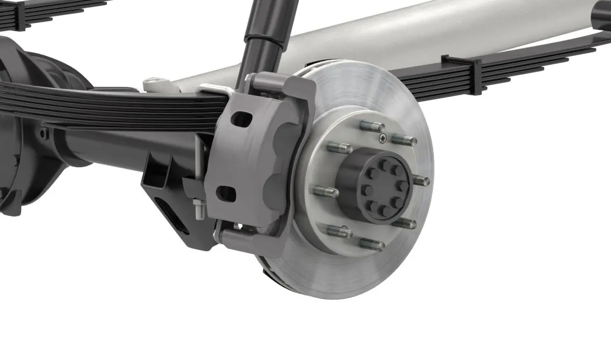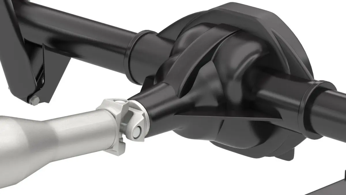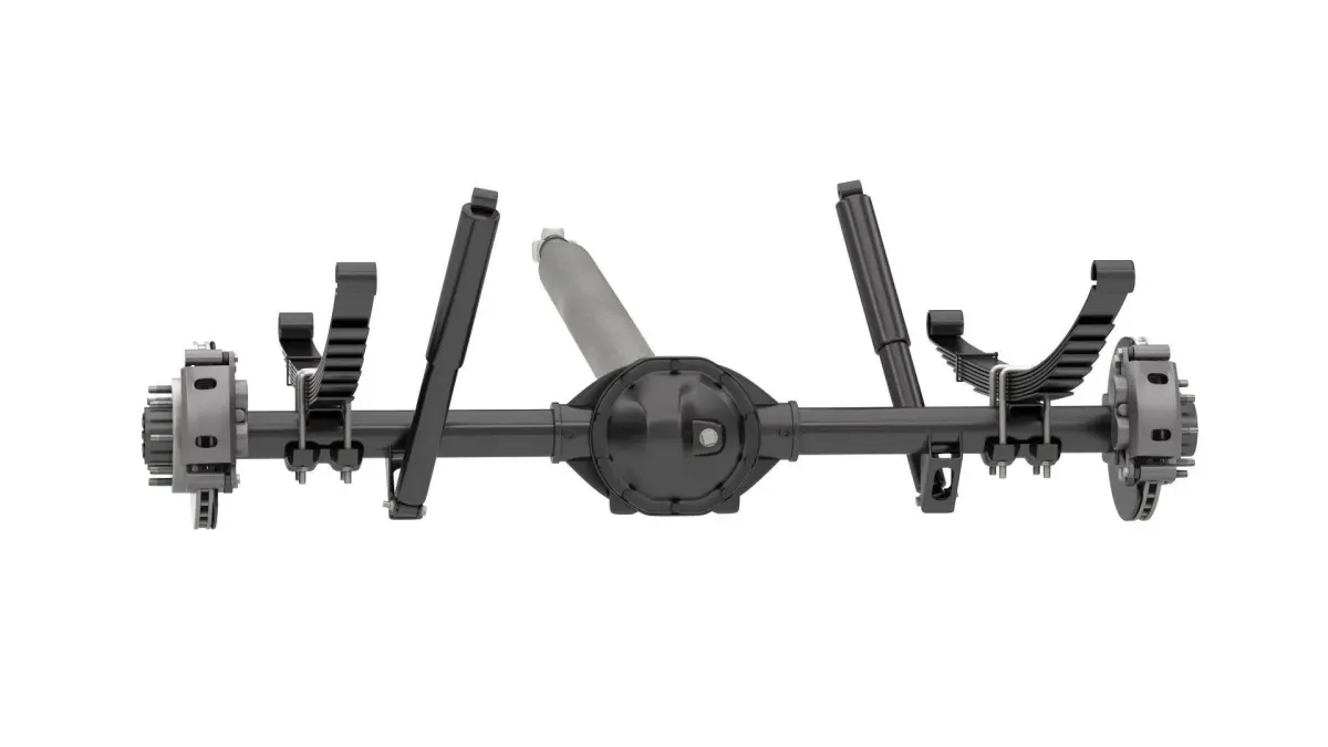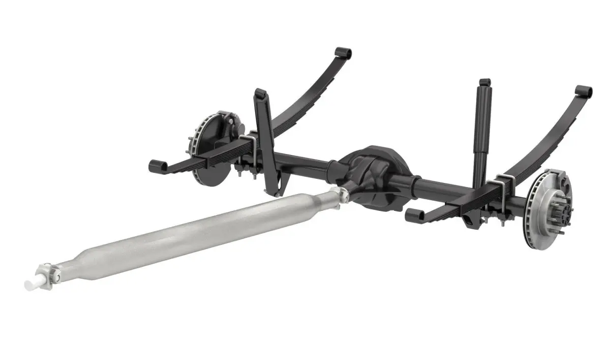 3D model of a heavy duty axle with driveshaft, brakes and suspension.