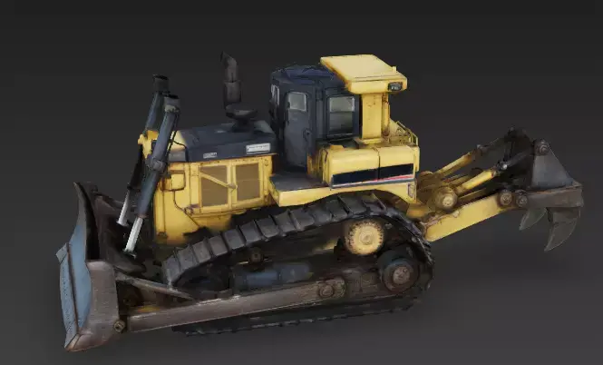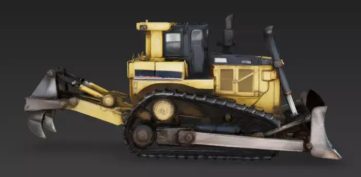 Metal Caterpillar Tracks Instead of wheels, the bulldozer moves on heavy metal tracks. The individual track links are detailed and covered in rust and dirt, giving the vehicle a look of immense weight and traction.
