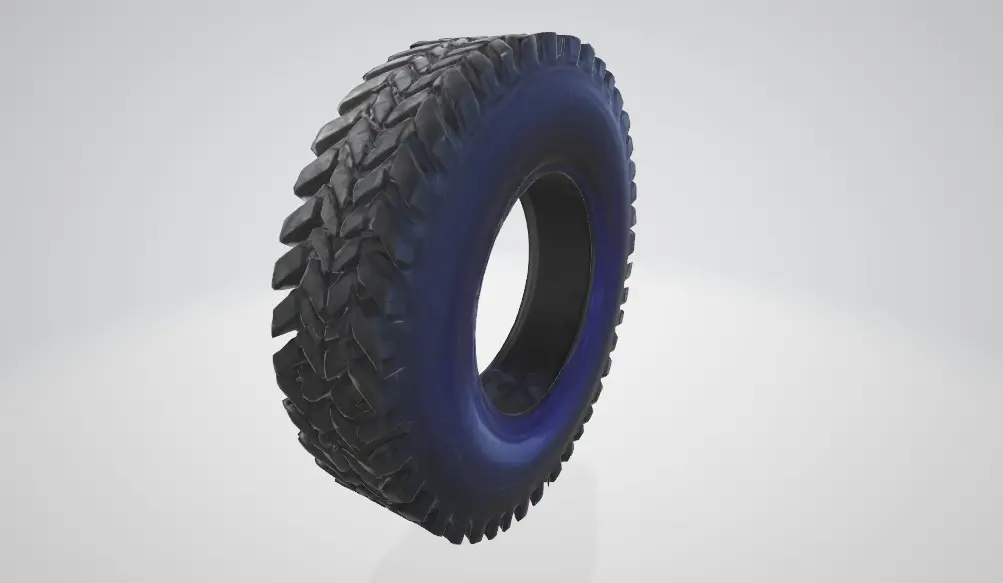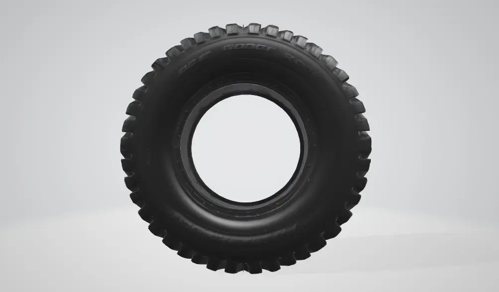 This 3D model represents a heavy-duty tire designed for off-road use, typically for large vehicles that require enhanced durability and traction in rugged environments. The tire model focuses on key features that improve performance on rough terrain. Key details observed in this model include: