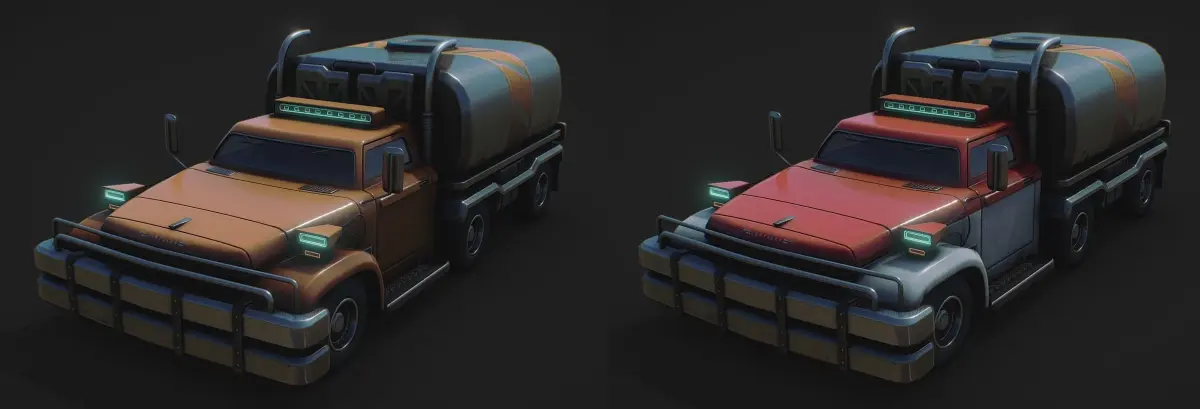 There are 3 variants of the truck - one with a company logo with red and white paintjob, one with no company logo, and one with a solid orange paintjob and no company logo.
