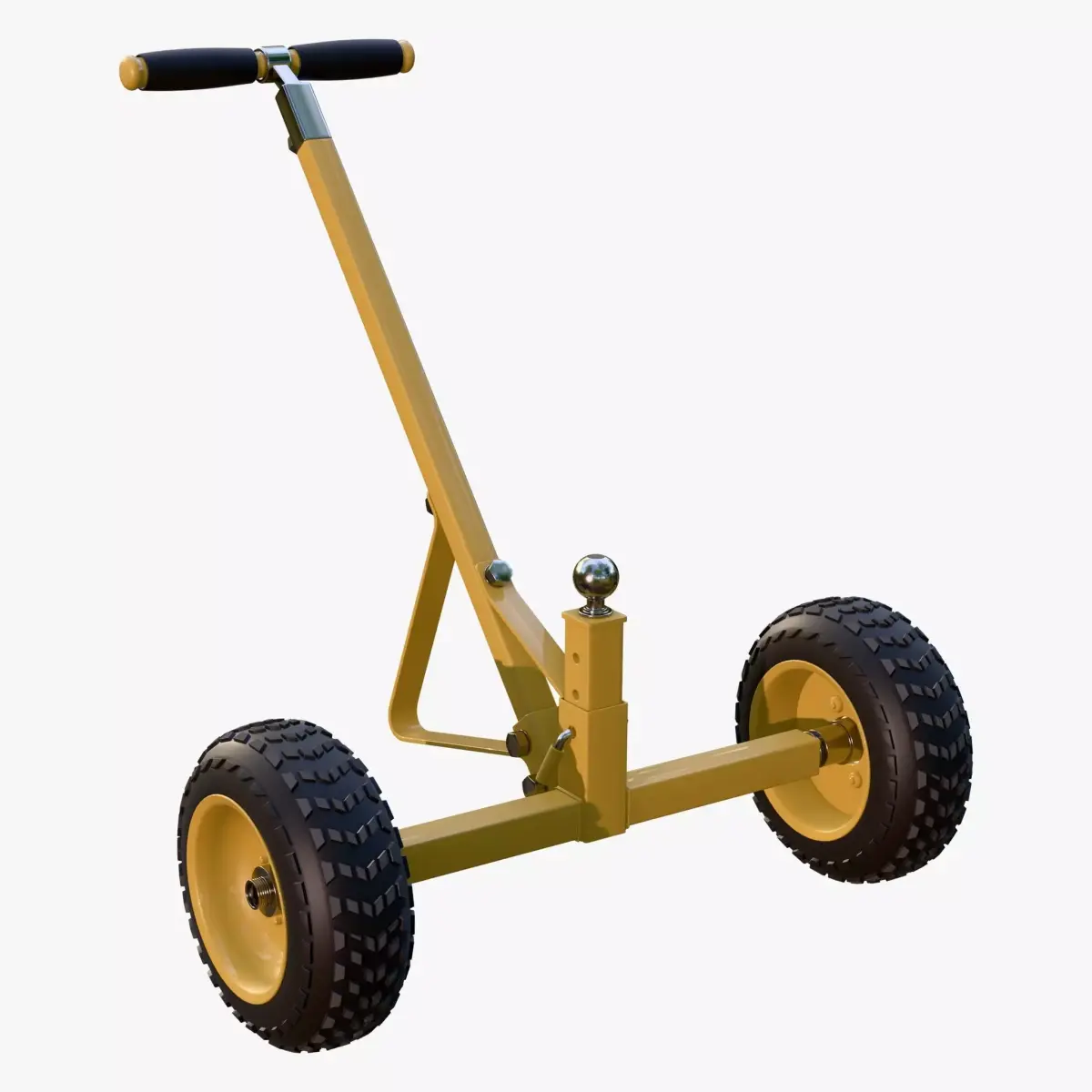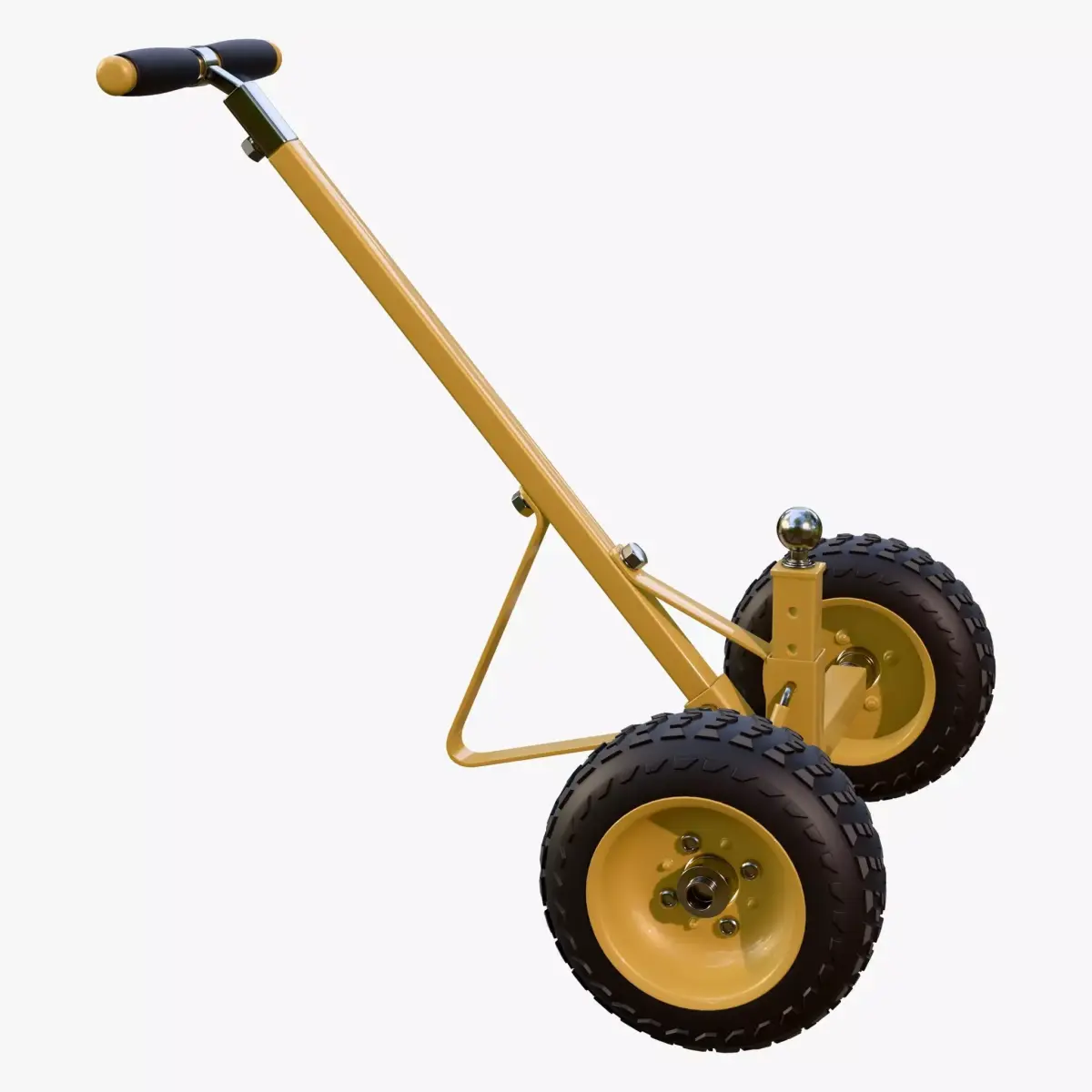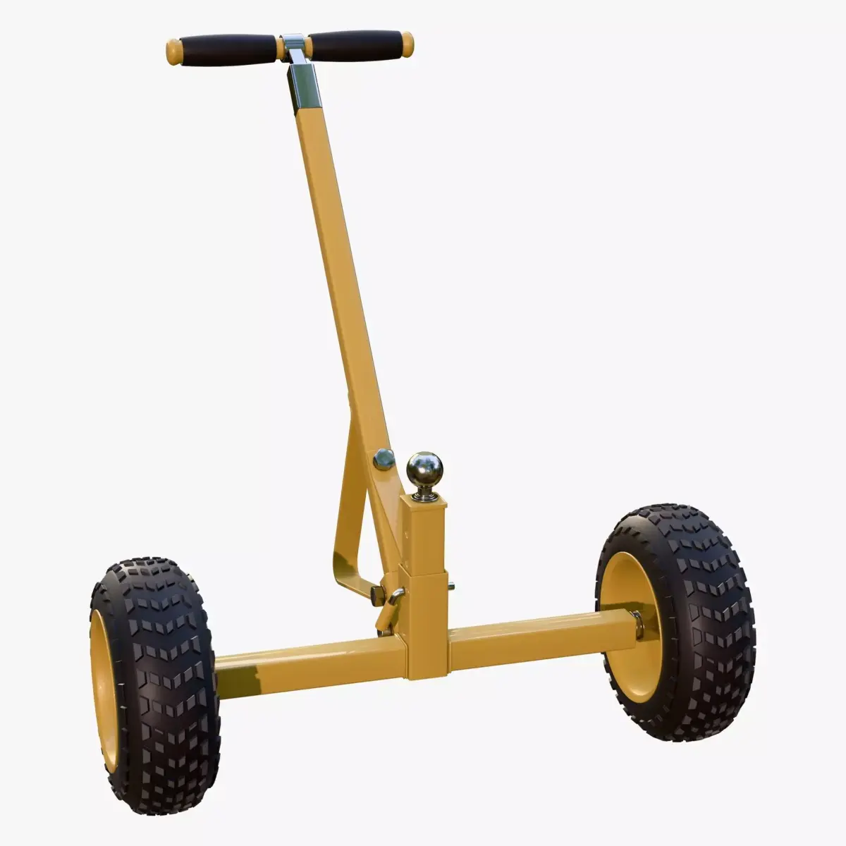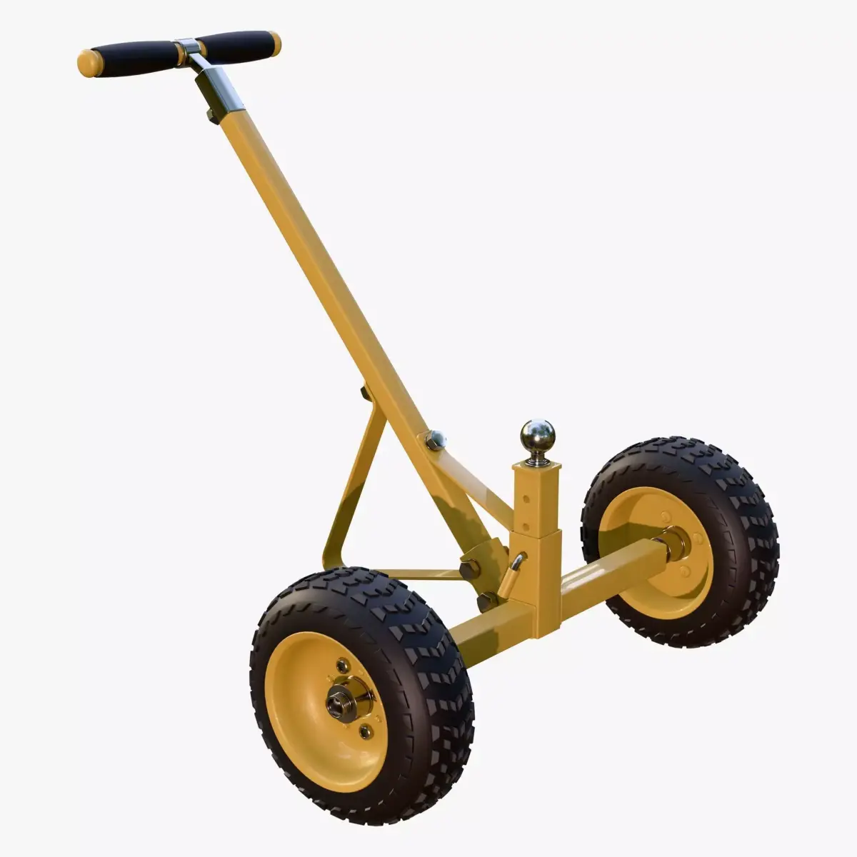 Manual dolly for maneuvering heavy trailers and boats. The device rests on two large wheels with aggressive treads. A long T-shaped handle with black rubber grips is provided for steering, and a standard chrome hitch ball is mounted at the base for coupling.
