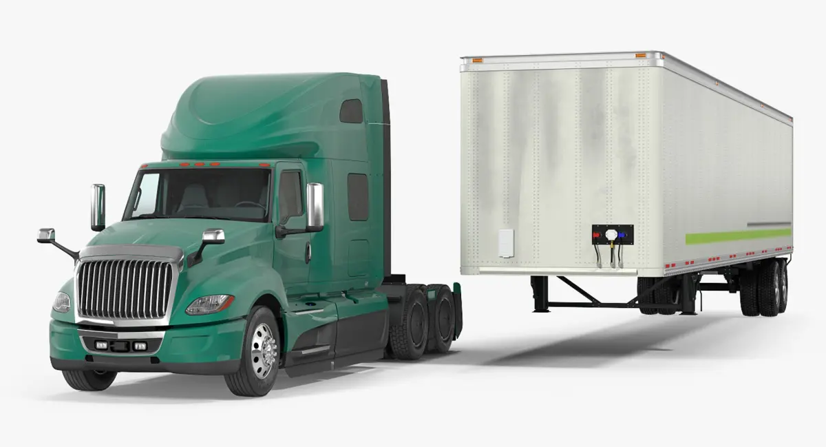 Semi-trailer truck (semi truck or semi) tractor and attached to it semi-trailer. Freight transport device for transporting and towing large cargo wheeled containers and trailers.