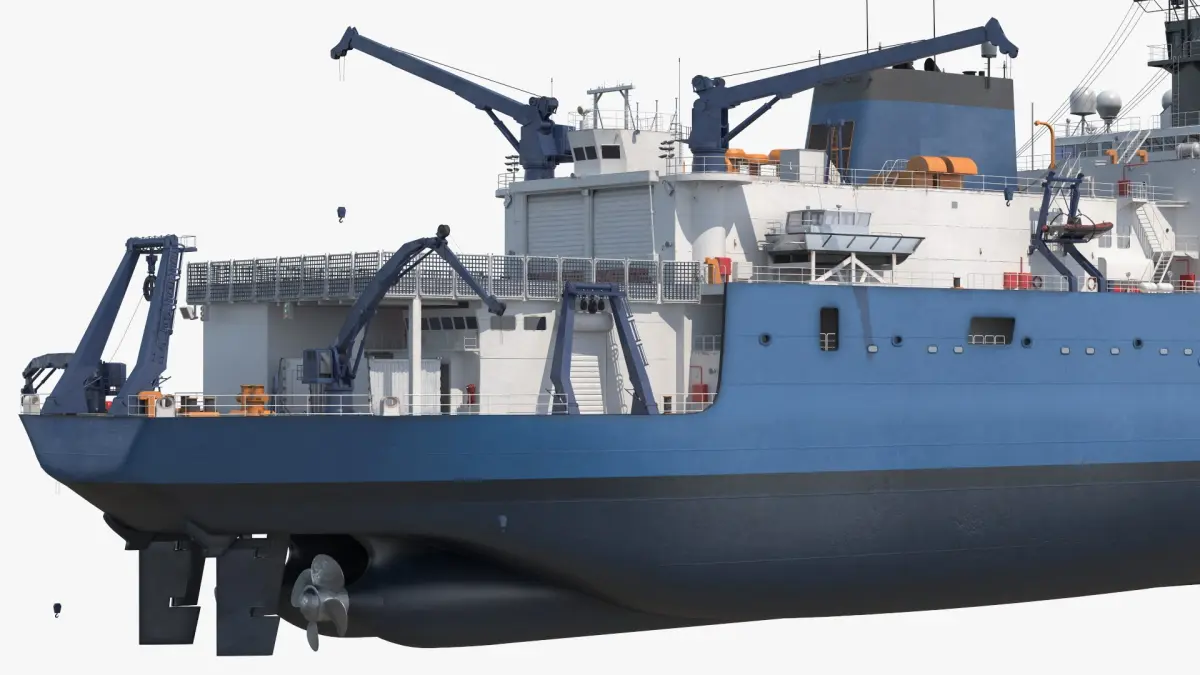Heavy Icebreaking Research Vessel Blue White Rigged is a 3d model of a robust ship engineered for navigating icy waters, essential for scientific expeditions in polar regions.