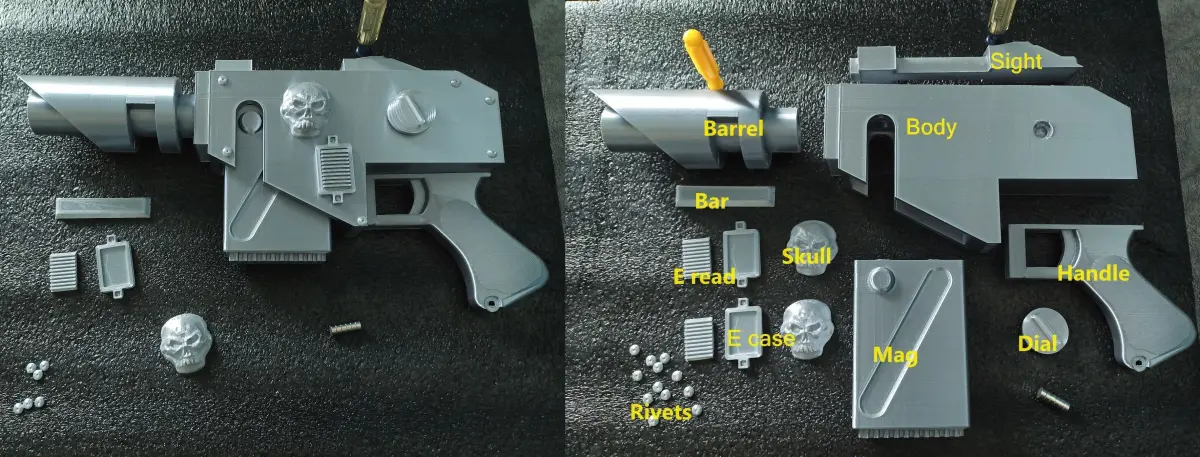 This is a set of models that will let you 3D print a Laspistol based on those found in the Warhammer 40,000 -verse.As for pattern, this one was heavily influenced by the Kantrael MG 'Defender' as well as an Accatran MkII, with some elements of others.
