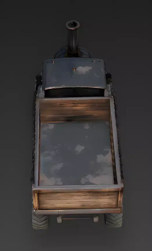 Wooden Cargo Bed The rear section is a simple open box made of thick, weathered wooden planks. It is held together by heavy iron chains that drape over the sides, reinforcing the idea that this vehicle is built for tough, industrial work.