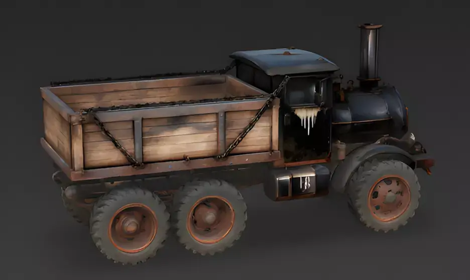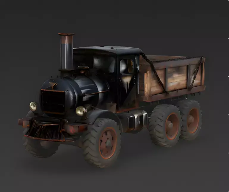 The Overall Concept This asset is a Steampunk heavy hauler that creatively mixes two types of vehicles. It combines the front end of an old steam train locomotive with the chassis and wheels of a rugged off-road truck.