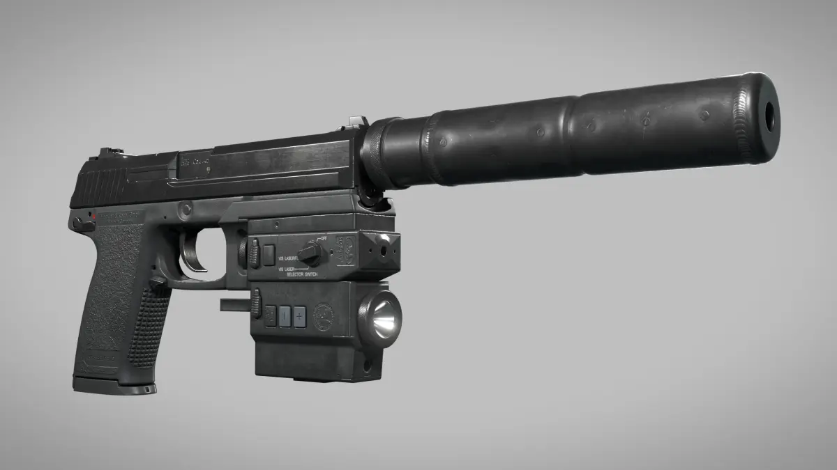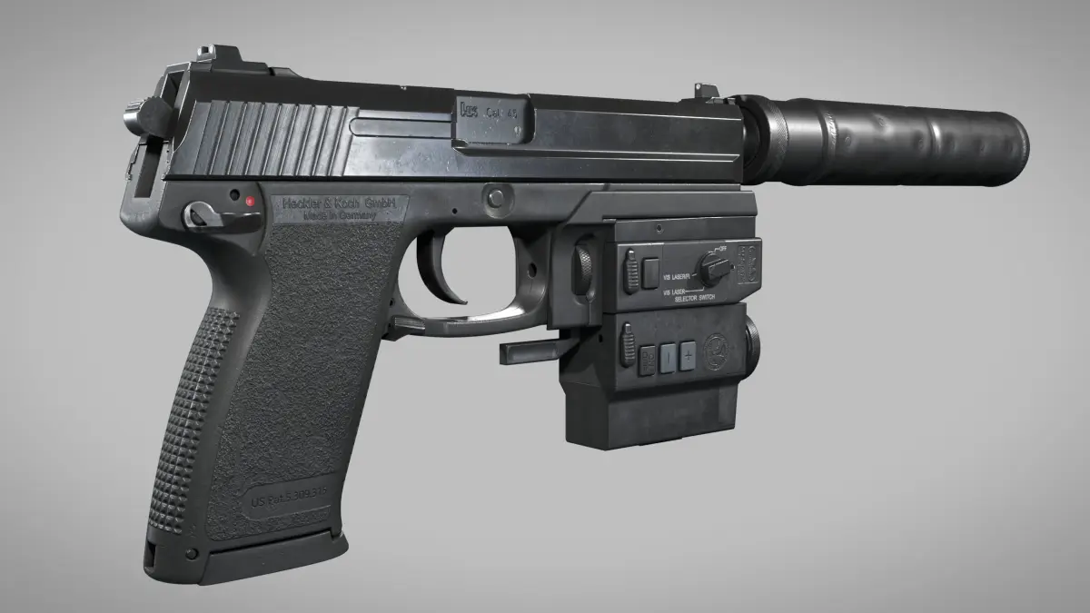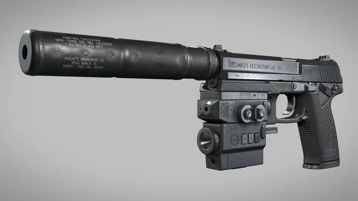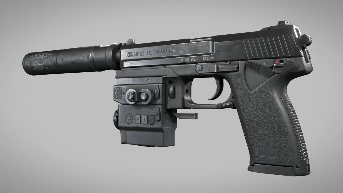 Real world accurate representation of Heckler & Koch MK23 USSOCOM pistol with suppressor and Wilcox Nightstalker LAM Unit.Designed with precision and attention to detail to represent the real thing as close as possible.