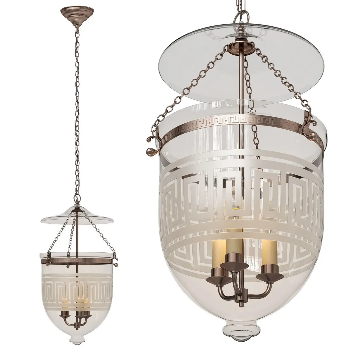 A classic Temple Light with a Greek design etched into the wide central band that covers the candles that support the lamps.The Greek key motif is repeated in the band that holds the cup.https://www.hectorfinch.com/products/temple-light-greek-model-iThe model is assembled for subdivision. When using import formats, please apply MeshSmoth/TurboSmoth with 2-3 iterations.Dimensions: D30sm x H65/132sm