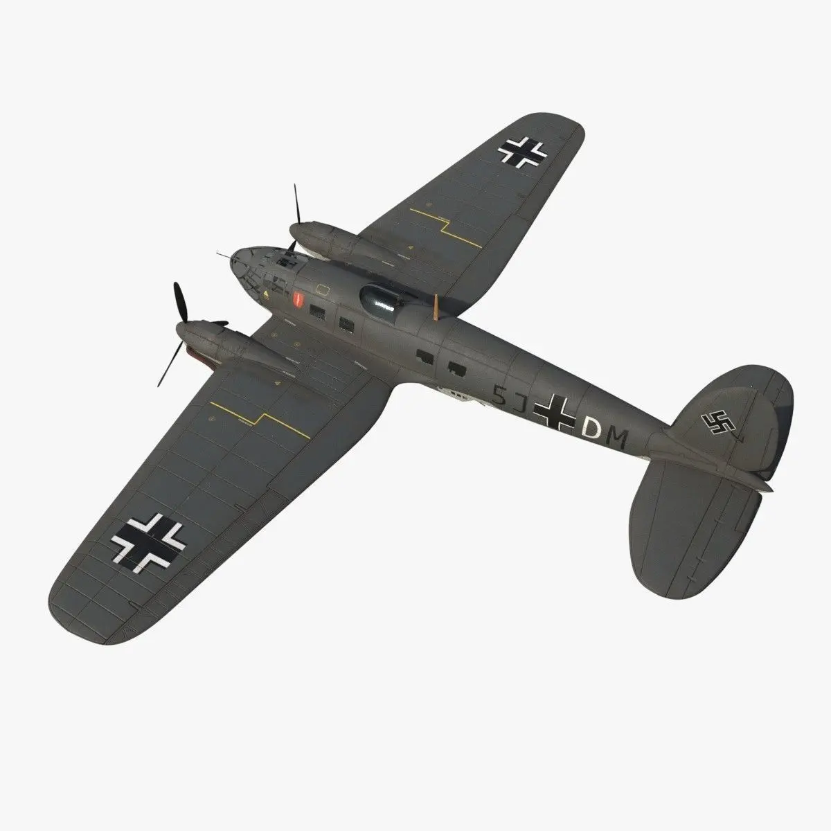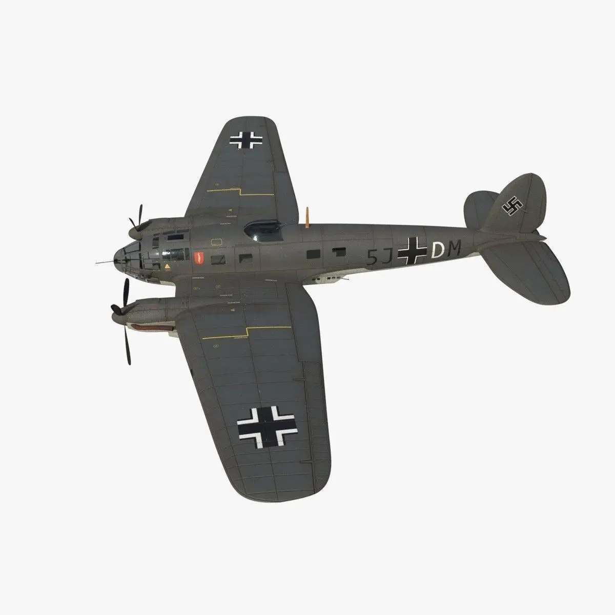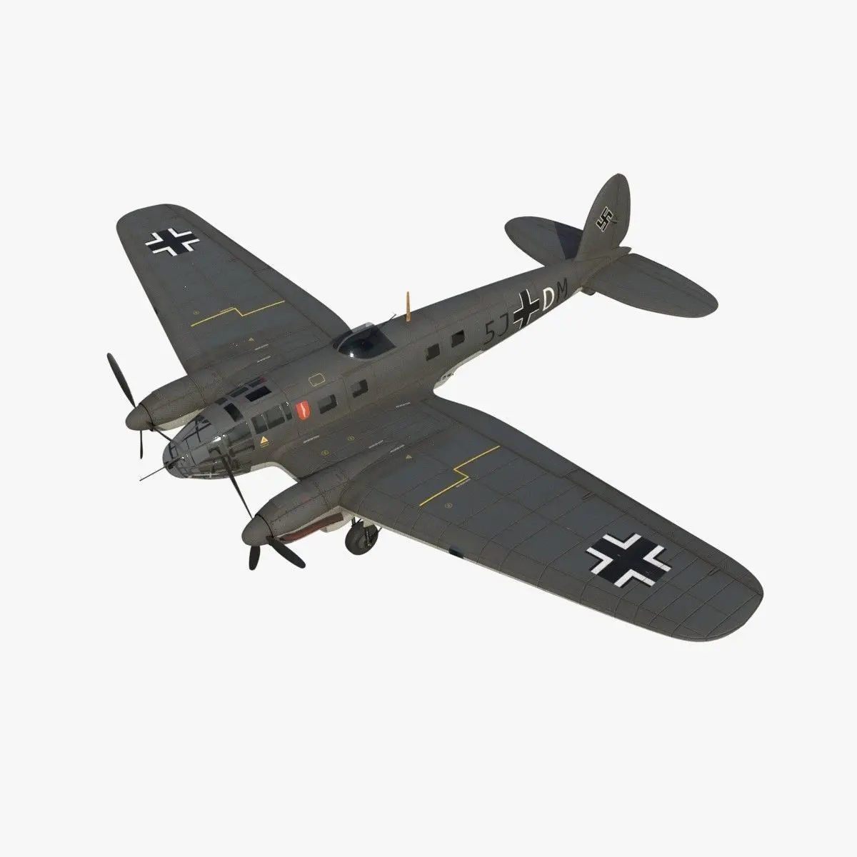 The Heinkel He.111 was a German bomber from the Luftwaffe used on many fronts in Europe during the WWII. This model is a historical re-enactment of the coded 5J+DM aircraft and commanded by the General Wever. This plane was integrated in the KG (Kampfgeschwader) 4 unit group. It was based in Eindhoven in Netherlands and it was in service in 1940. This He.111 was used for night raids to Britain. The aircraft was shot down by 23 Sqn, RAF at Clay, Norfolk on night of Wednesday, 19th June 1940.