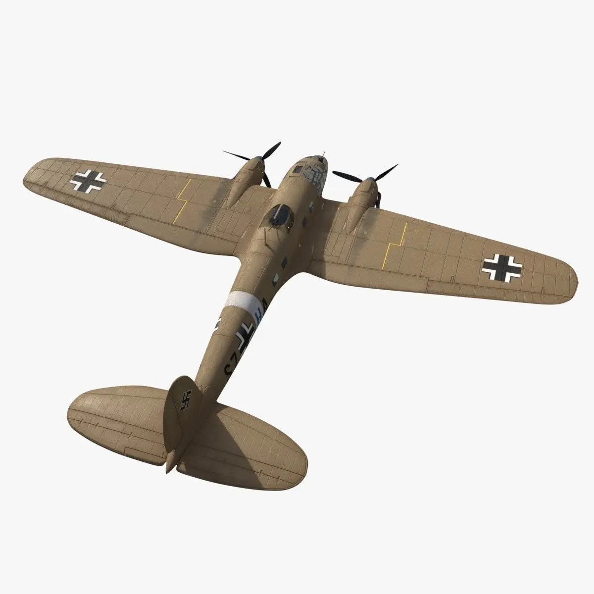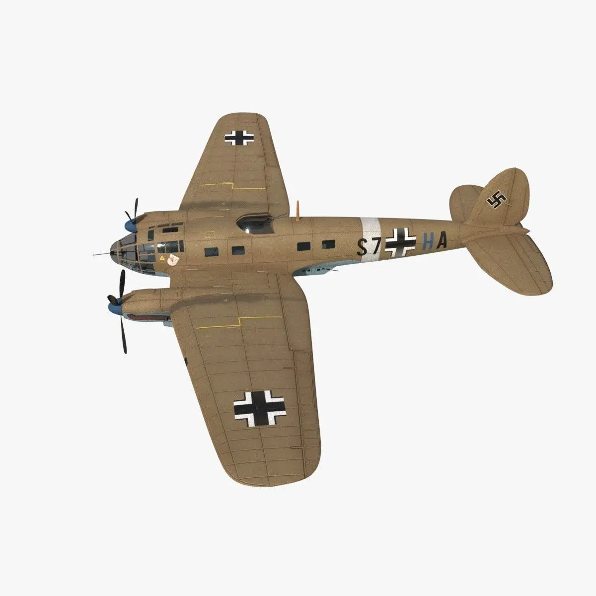 The Heinkel He.111 was a German bomber from the Luftwaffe used on many fronts in Europe and Africa during the WWII. This model is a historical re-enactment of the coded S7+HA aircraft. This plane was integrated in the STG (Geschwaderstab) 3 unit group. It was based in Derna in Lybia and it was in service during September of 1941. This He.111 was used to Transport of staff of Group and 3rd Squadron in connection with an operation lasting 4 days (assault on Tobruk).