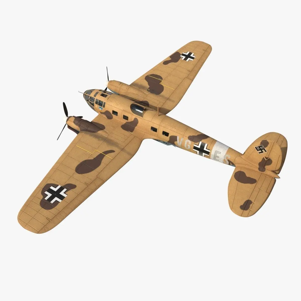 The Heinkel He.111 was a German bomber from the Luftwaffe used on many fronts in Europe and Africa during the WWII. This model is a historical re-enactment of the coded VG+ES aircraft. This plane was integrated in the STG (Geschwaderstab) 3 unit group. It was based in Derna in Lybia and it was in service during summer of 1942. This He.111 was used as the personnel transport for Erwin Rommel across North Africa.