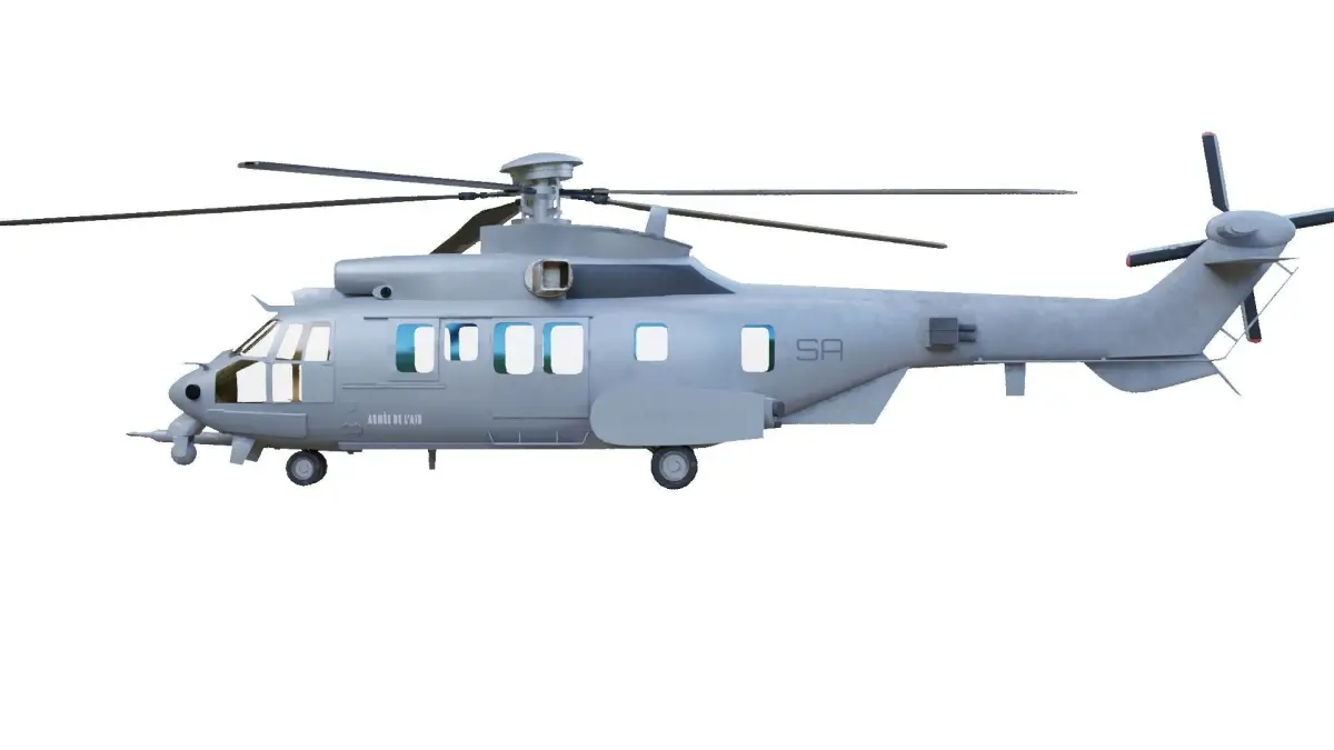 It is distinguished by a main rotor of the spheriflex type with five blades. Its cell can be in short or elongated version. It can be motorized in two ways: the Makila 2A or 2A1.The civil designation of this device is AS332 L1 and AS332 L2. The AS332 L2 evolution of the L1 is distinguished by a main rotor of spheriflex type and a rear spheriflex rotor with 4 blades, a more powerful engine (Makila 2A of 2,140 hp) and more modern avionics, screens, autopilot navigation. The AS332 L2 is widely used in the offshore sector for connections with oil platforms. It is specially designed for combat rescue and long distance troop transport missions.Its RESCO version (combat search and rescue) has been operational since June 2006.This very sophisticated device is the first French helicopter equipped with an armor and self-protection system including radar detection of missiles. The EC725 is also equipped with a FLIR turret which gives it night and all-weather intervention capacity.Its in-flight refueling pole allows it to fly 10 hours as the Air Force has demonstrated in operational conditions.It can carry up to 28 commandos or 10 stretchers for medical evacuation, its maximum speed is 325 km / h with 285 km / h at cruising speed and it carries the following equipment:Latest generation digital avionics managed by a CMA 9000 central computer.4-axis autopilot which gives it excellent agility.Thales radio communications equipmentInertial unitFLIR infrared camera Safran Electronics & Defense intended, among other things, for observation, all day and night, surveillance and even piloting assistance.Self-protection system complete with a radar alert detector, a missile departure detector, a decoy and electronic warfare system.The rustic conditions of engagement in the Sahel lead to frequently changing the Makila 2A1 engines of which the French Army is the only user in 2014. Their period of employment being only from 60 to 100 hours, instead of the 3,000 hours indicated by the engine manufacturer, and the cost of each maintenance operation being from 300,000 to 600,000 euros excluding taxes 7. Their average consumption is 800 liters of kerosene per hour of flight.