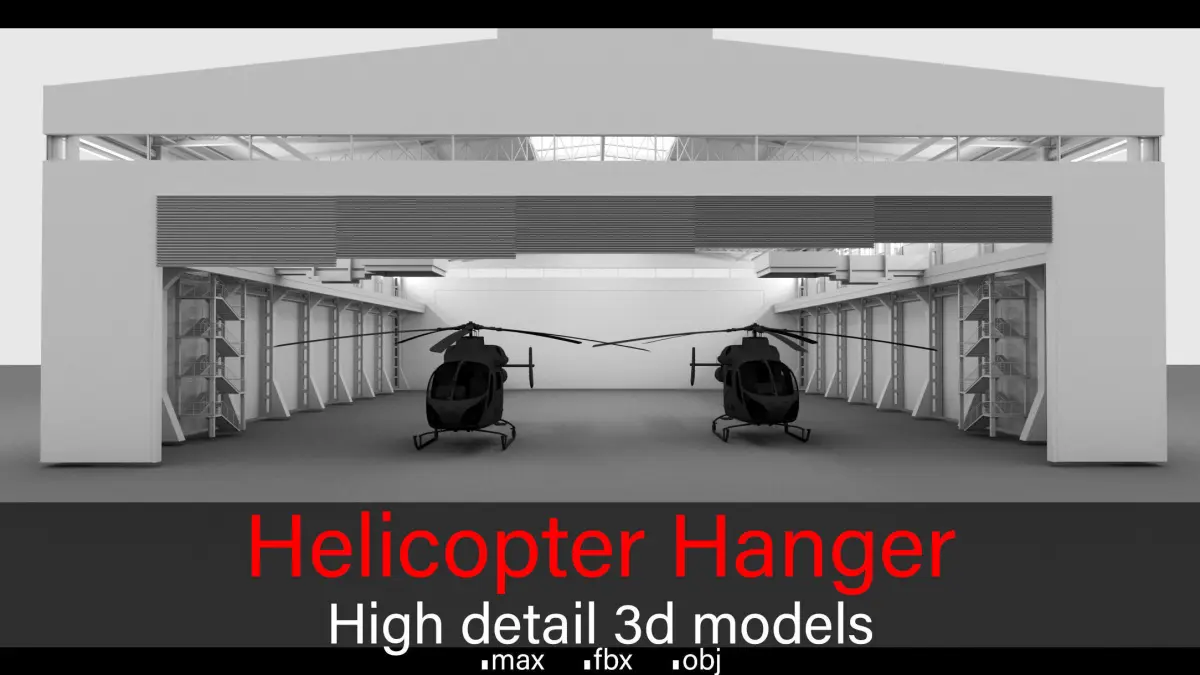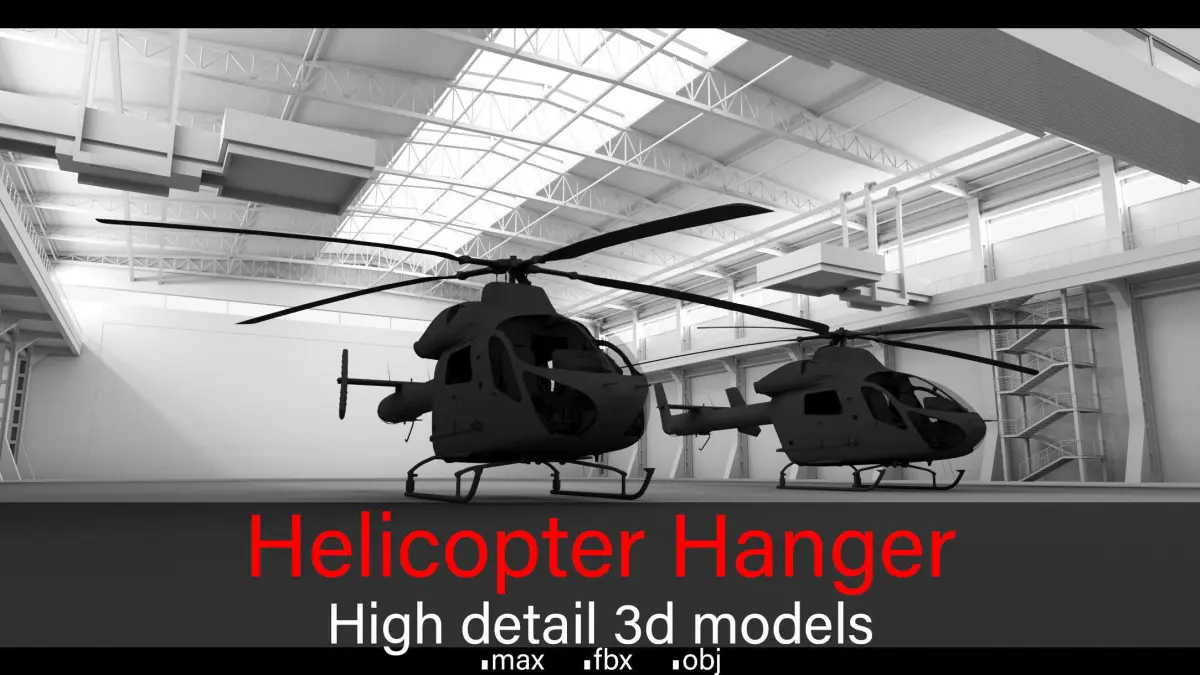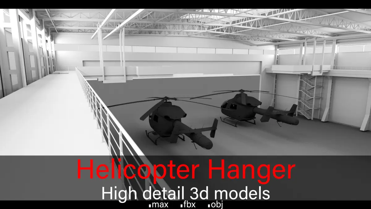 This product includes Helicopter Hanger+ Helicopters- High detail 3d models in 3 formats