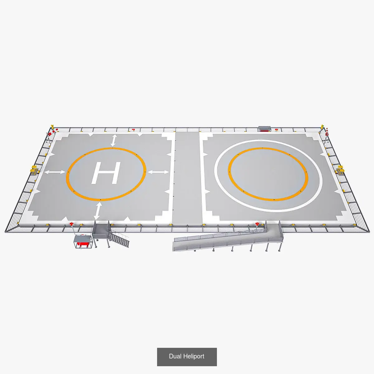 A collection of fully equipped octagonal, circular, square and dual heliports, modeled and rendered in Cinema 4D. The dual heliport was rendered in V-Ray 5. The models were created using approximate real world dimensions.