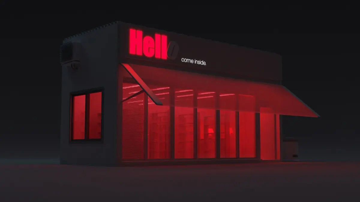 storefront model with Hell glowing and 'o' turned off. storefront with shelf and whole equipment in it.