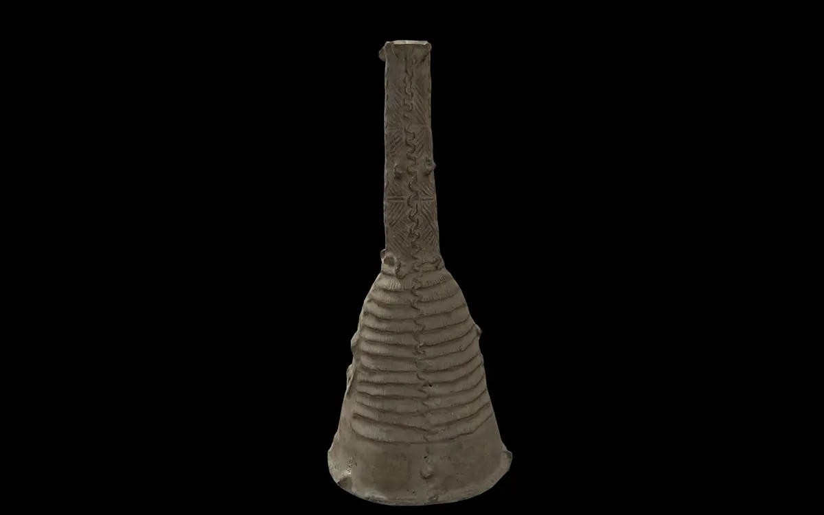 This brass helmet mask, created by Edo artists using the lost-wax technique, represents a stylized human head with bold features and ritual scarification marks. A tall, tapering projection rises from the head, decorated with serpents and long-nosed crocodiles—symbols of spiritual power and protection. Similar motifs appear on the chin, while incised crosses on the neck may hold cosmological significance. Pierced holes along the base suggest the mask was worn or mounted during ceremonies associated with Oduduwa, a revered ancestral figure linked to divine kingship.