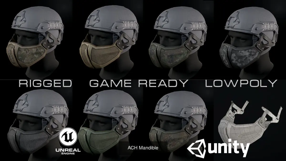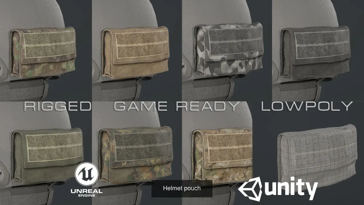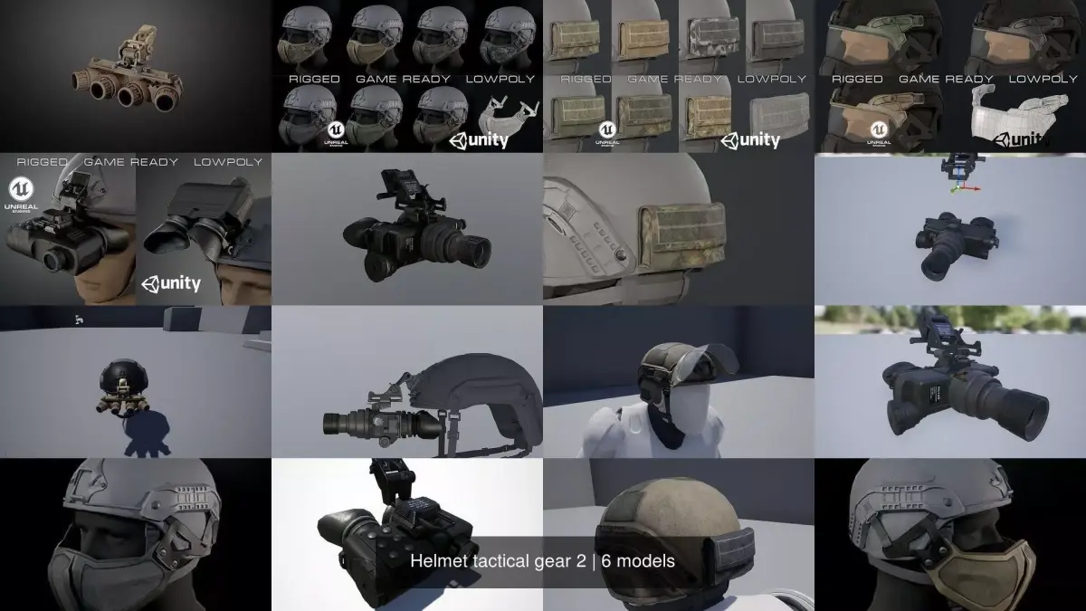 Tactical gear for helmets. 6 low-poly 3d model ready for Virtual Reality (VR), Augmented Reality (AR), games and other real-time apps.