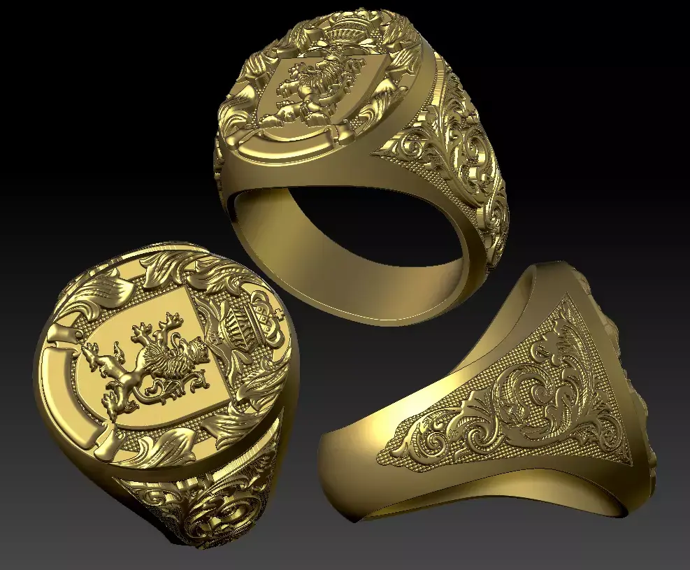This is a high-detail 3D signet ring model featuring a classic heraldic lion crest, sculpted in a traditional European royal style.The ring face displays a raised shield with a roaring lion emblem, crowned at the top and framed by symmetrical laurel leaves, symbolizing power, nobility, authority, and lineage.