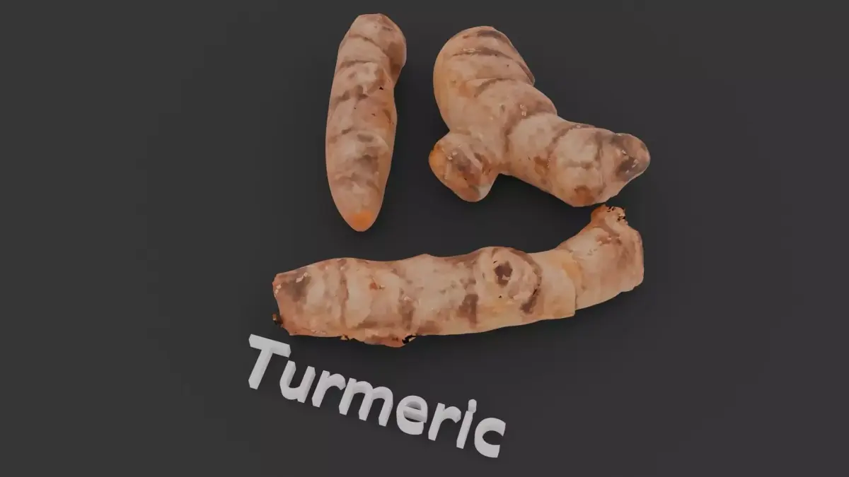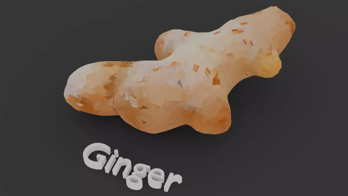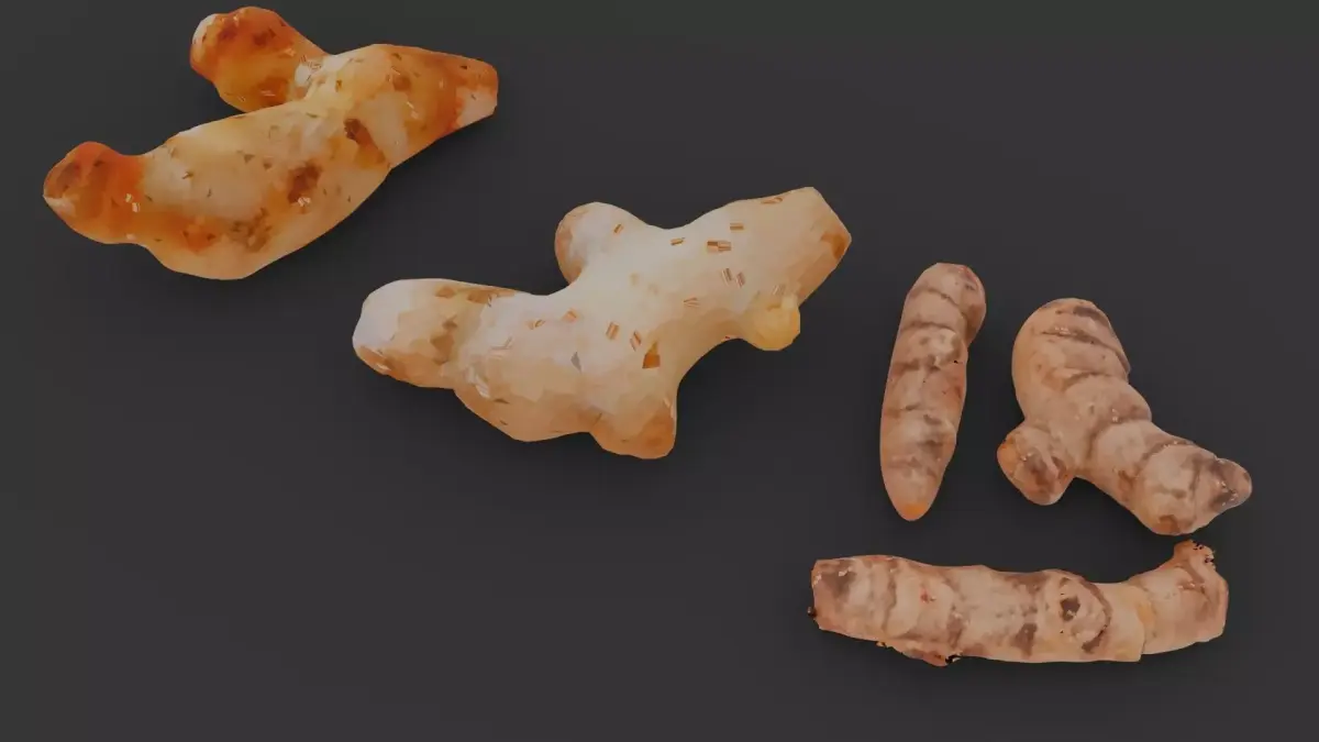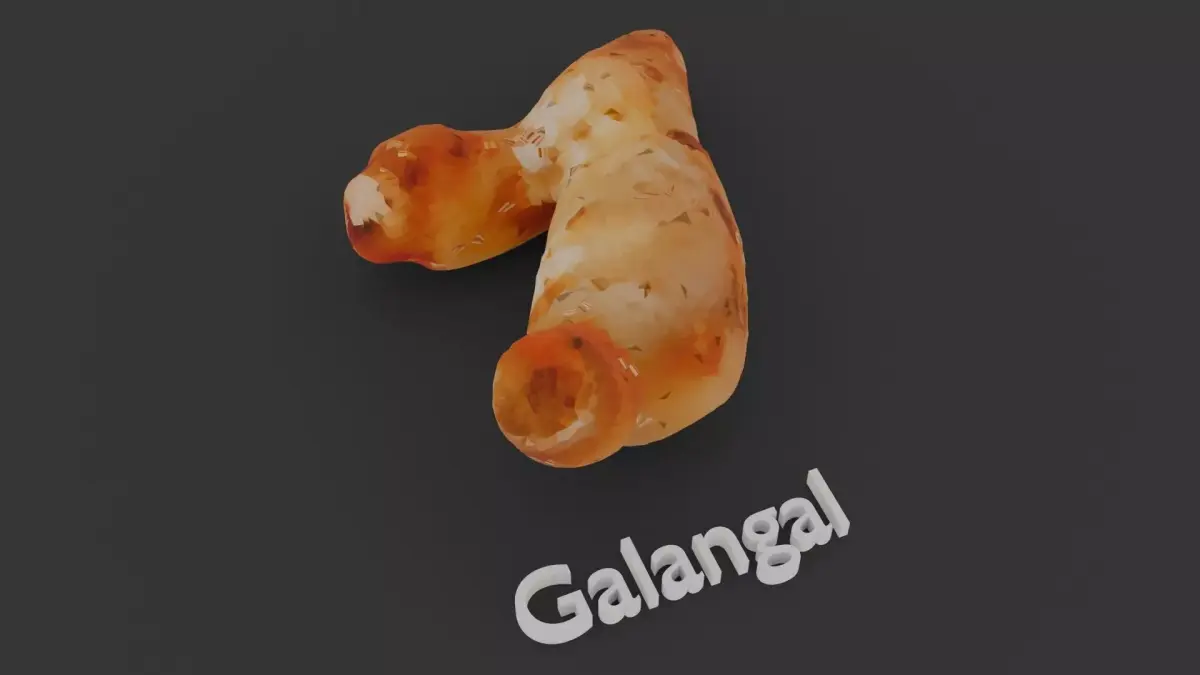 This 3D model set features three distinct rhizomes: Galangal, Ginger, and Turmeric, each sculpted with unique shapes and surface details to reflect their real-world botanical characteristics. Galangal is smoother and reddish, Ginger is knobby and light brown, while Turmeric has a segmented, rougher texture. The models are ideal for use in educational content, herbal-themed visualizations, or culinary scenes.