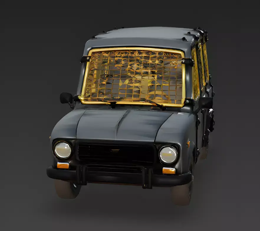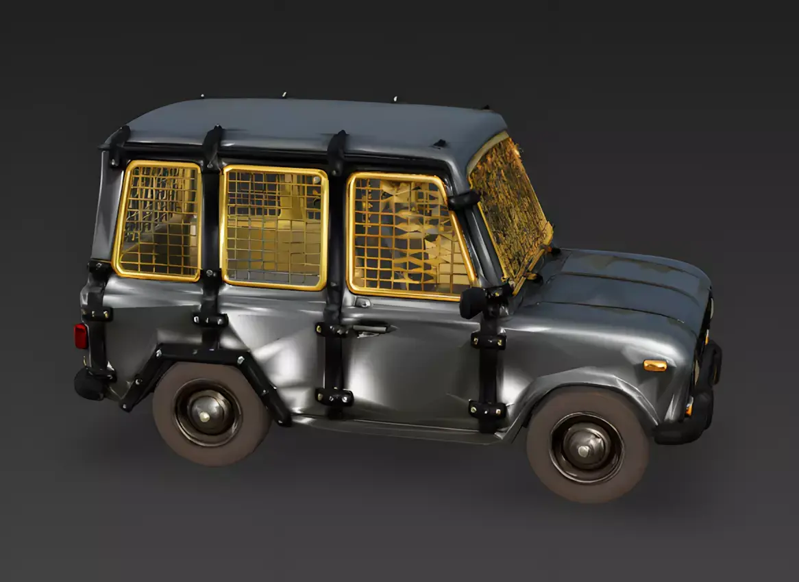 Reinforced Gold-Chrome GrillesA standout feature of this design is the large, gold-chrome protective grilles covering the windows and windshield. These grilles are modeled as chunky, solid geometry to provide a high-contrast luxury feel while strictly adhering to the no-glass design requirement.