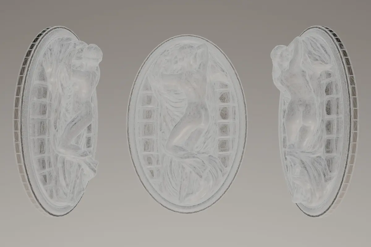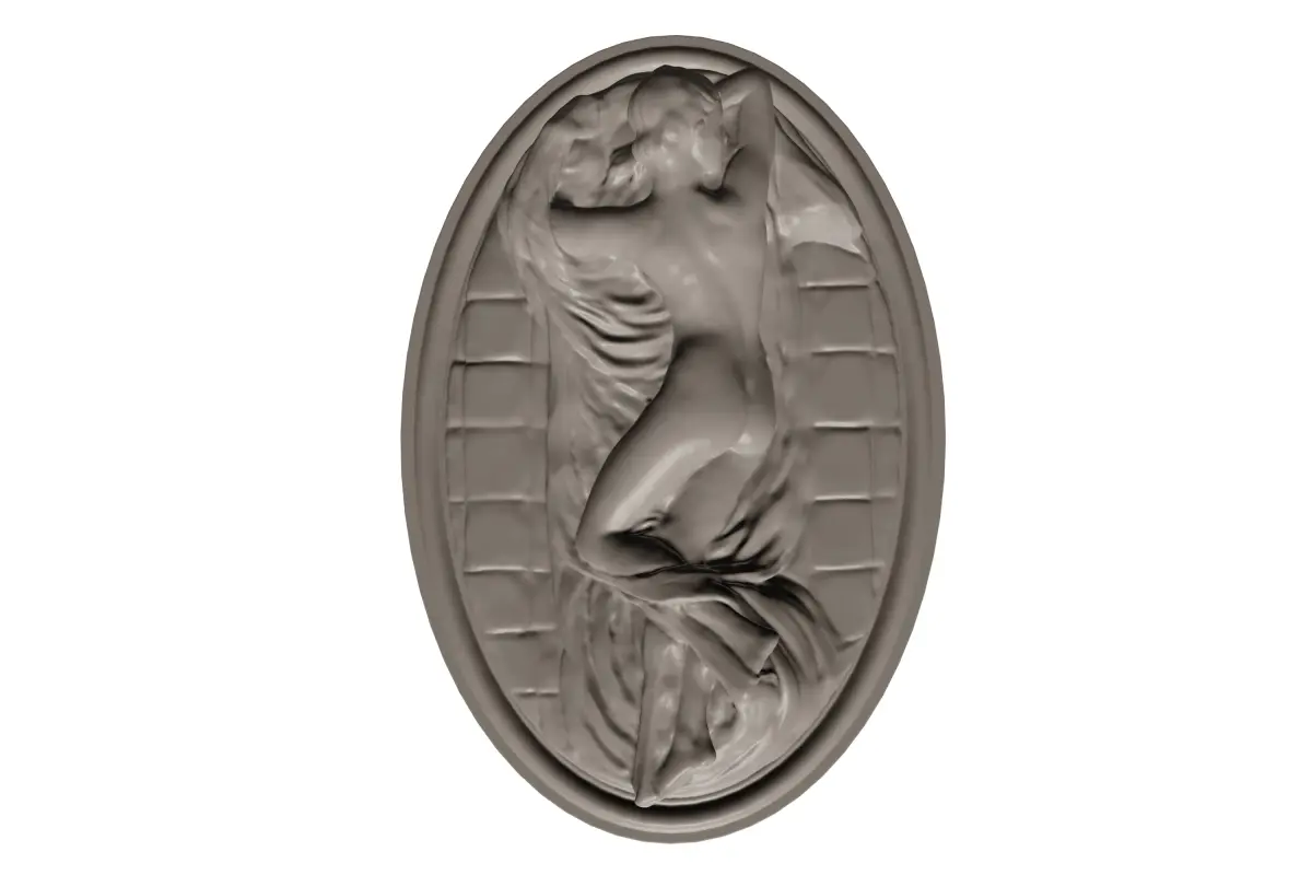 This is a meticulously crafted 3D model, representing a modern reinterpretation of the classic Hermaphrodite sculpture. Designed specifically for 3D printing, this model captures the intricate details and flowing forms of the original artwork while being optimized for additive manufacturing processes. It features a figure reclining on a textured, relief-like base, all contained within an oval frame.