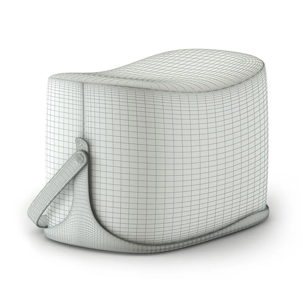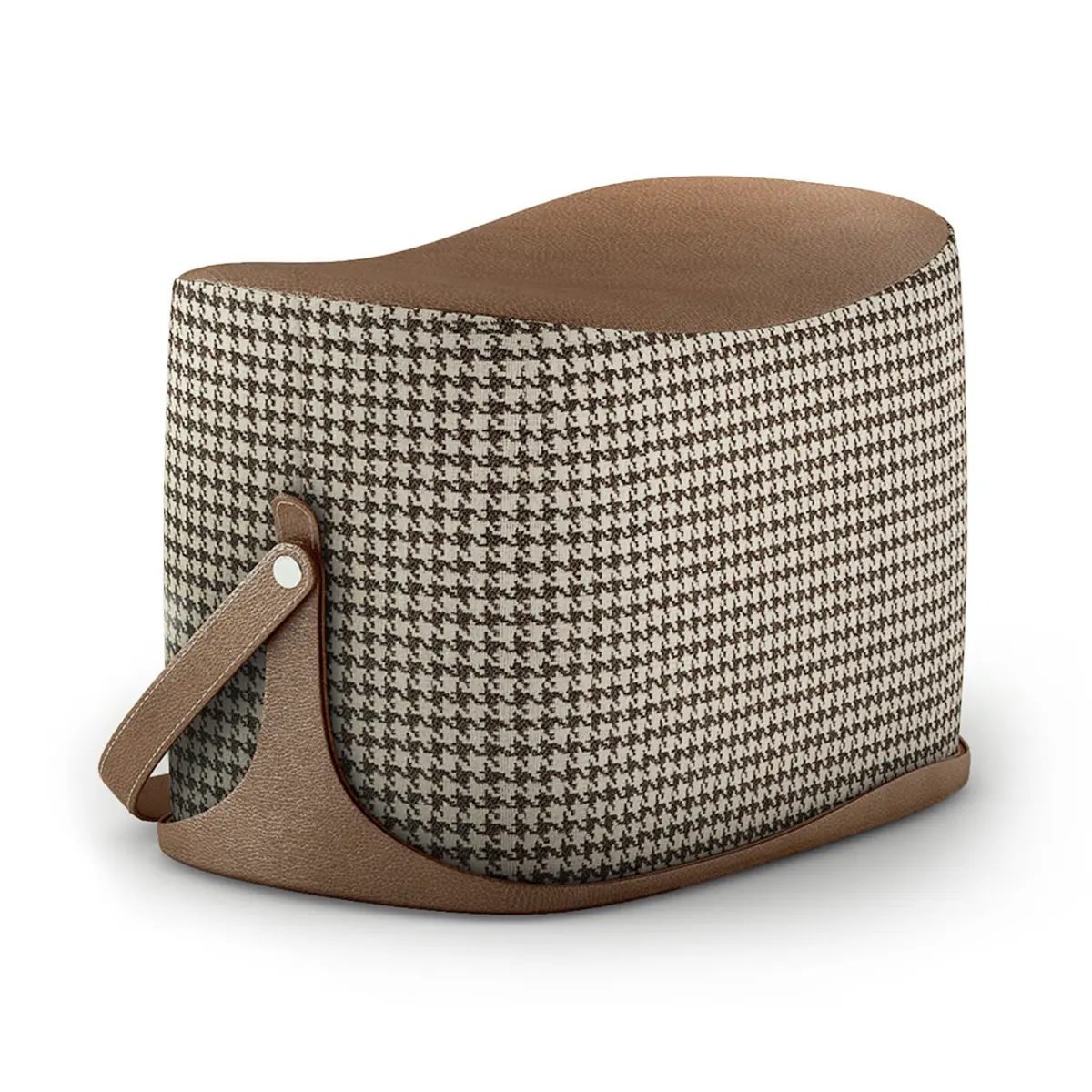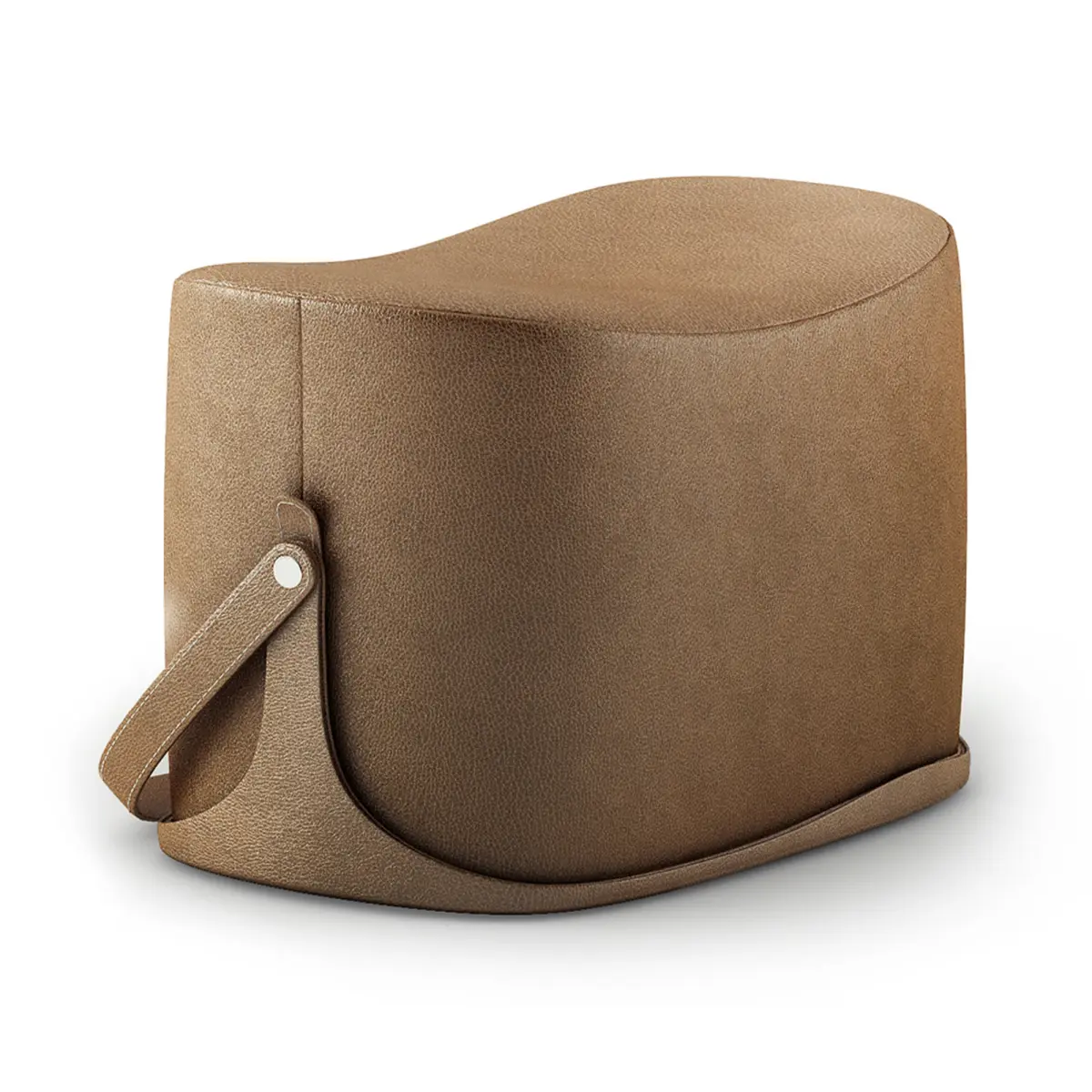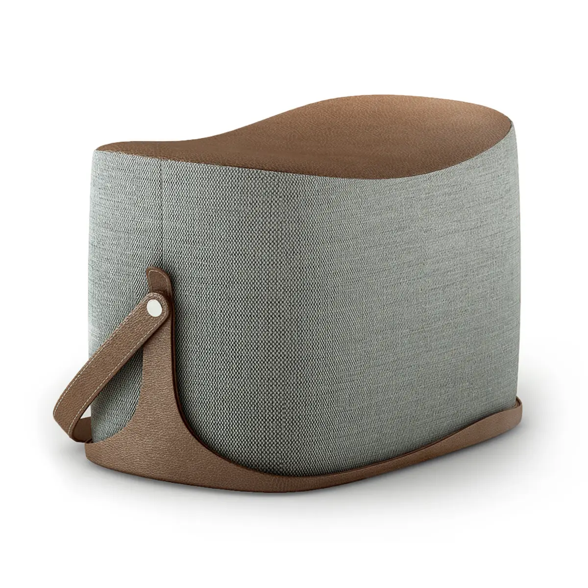 Ottoman with strap that makes it highly portable. Storage area covered in leather.