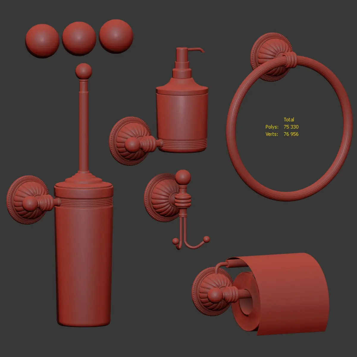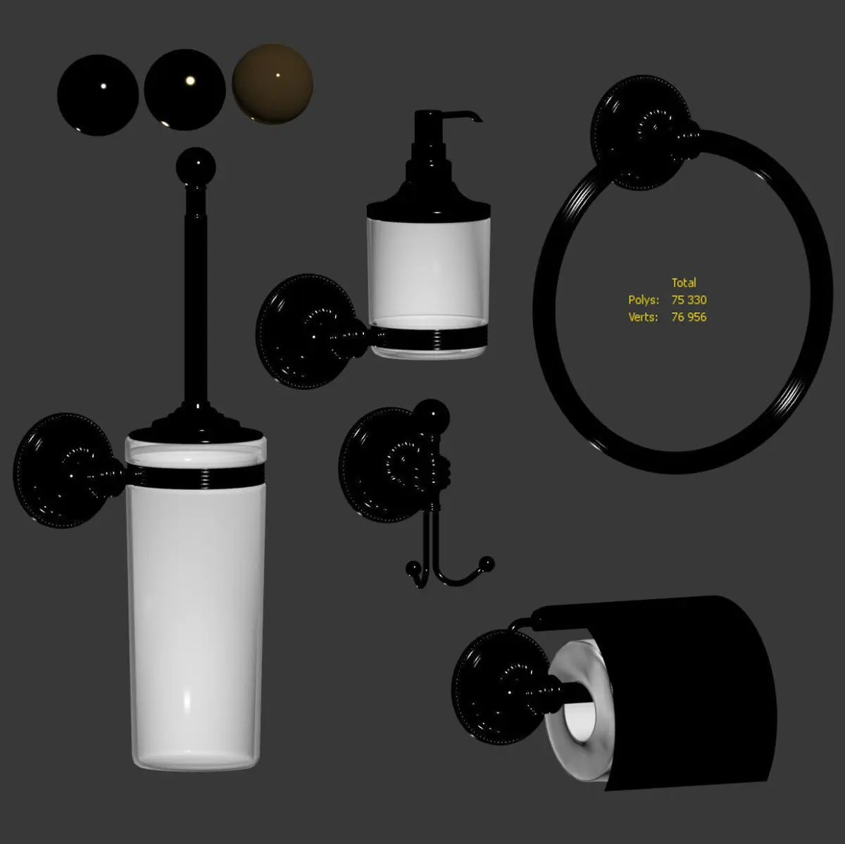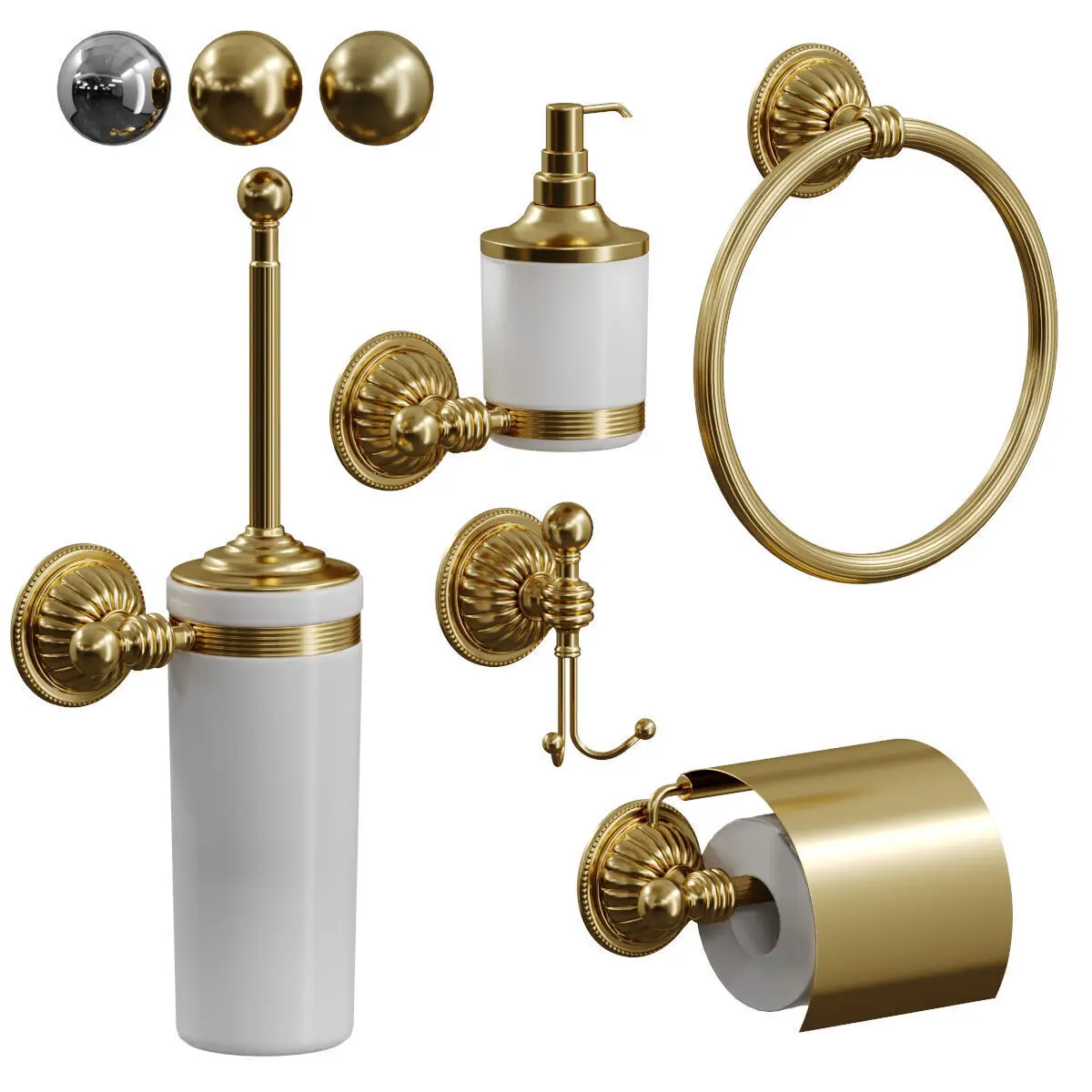 Includes: hook for clothes or towel, dispenser, toilet paper holder, toilet brush, towel holder