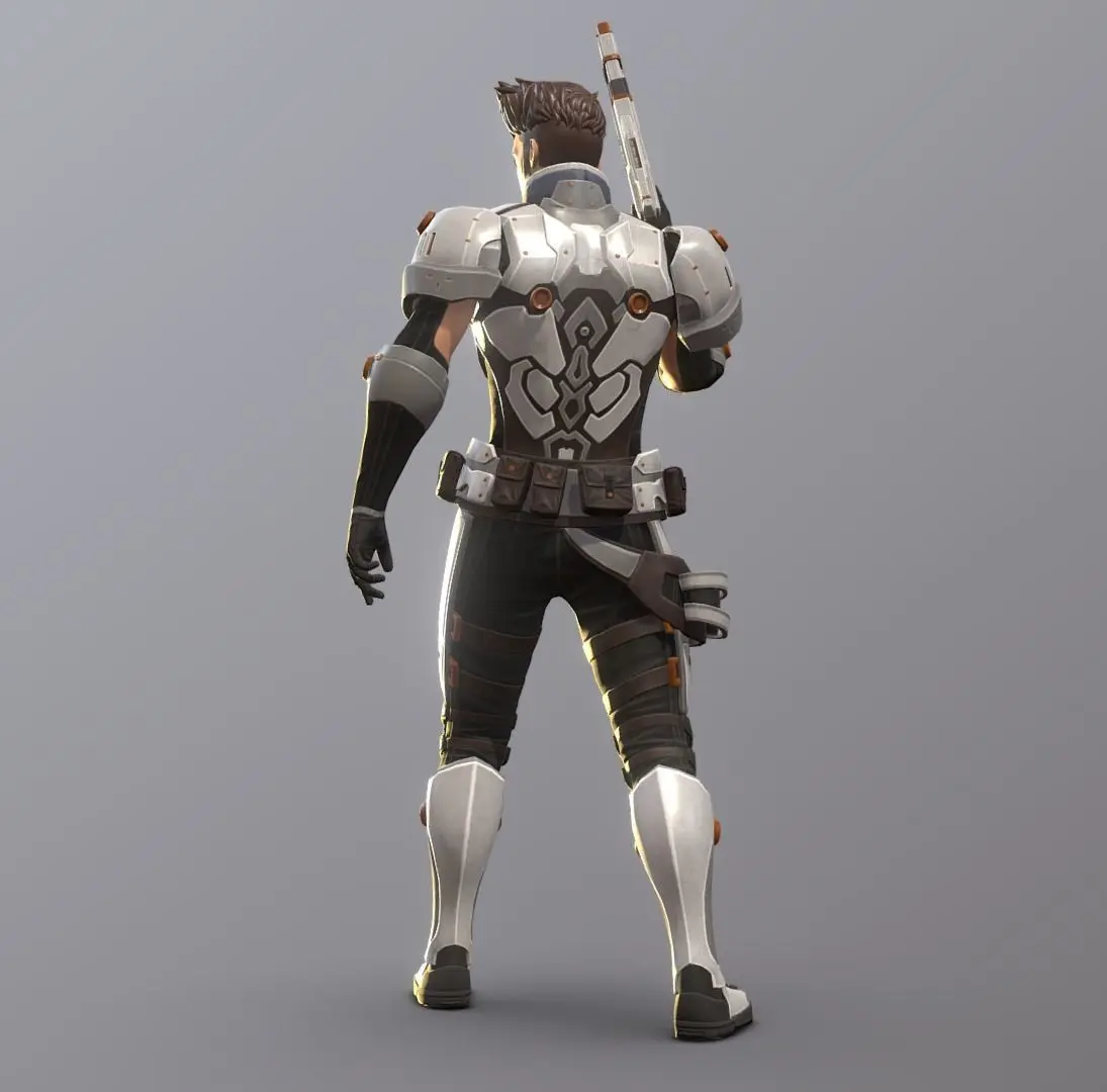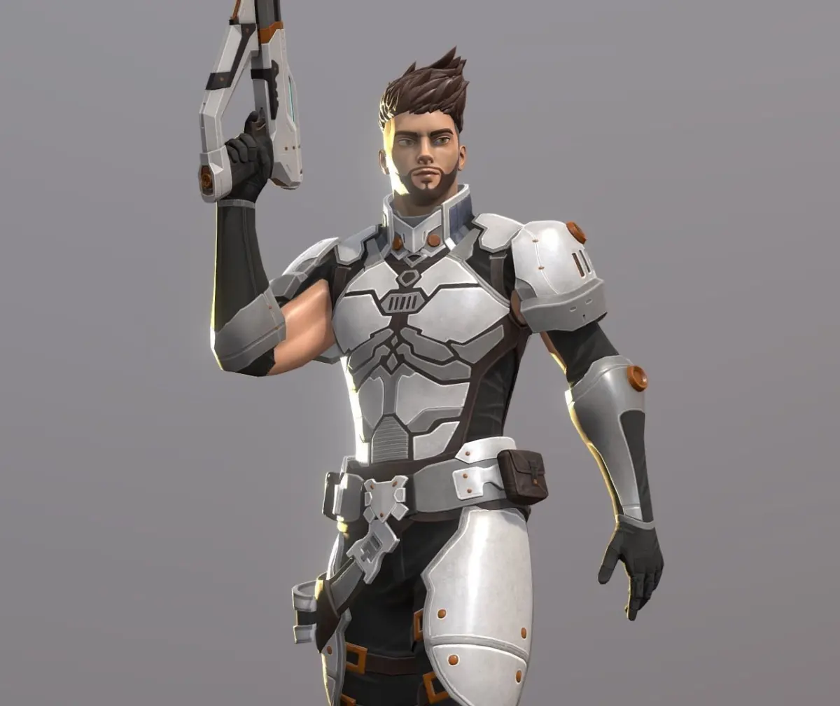 Character with a bit of an Overwatch style. Rigged (with 3ds max CAT rig system) but no animations. Face has a simple rig (eyes rotate, eyelids close and mouth open). Body, head and weapon use separated materials.