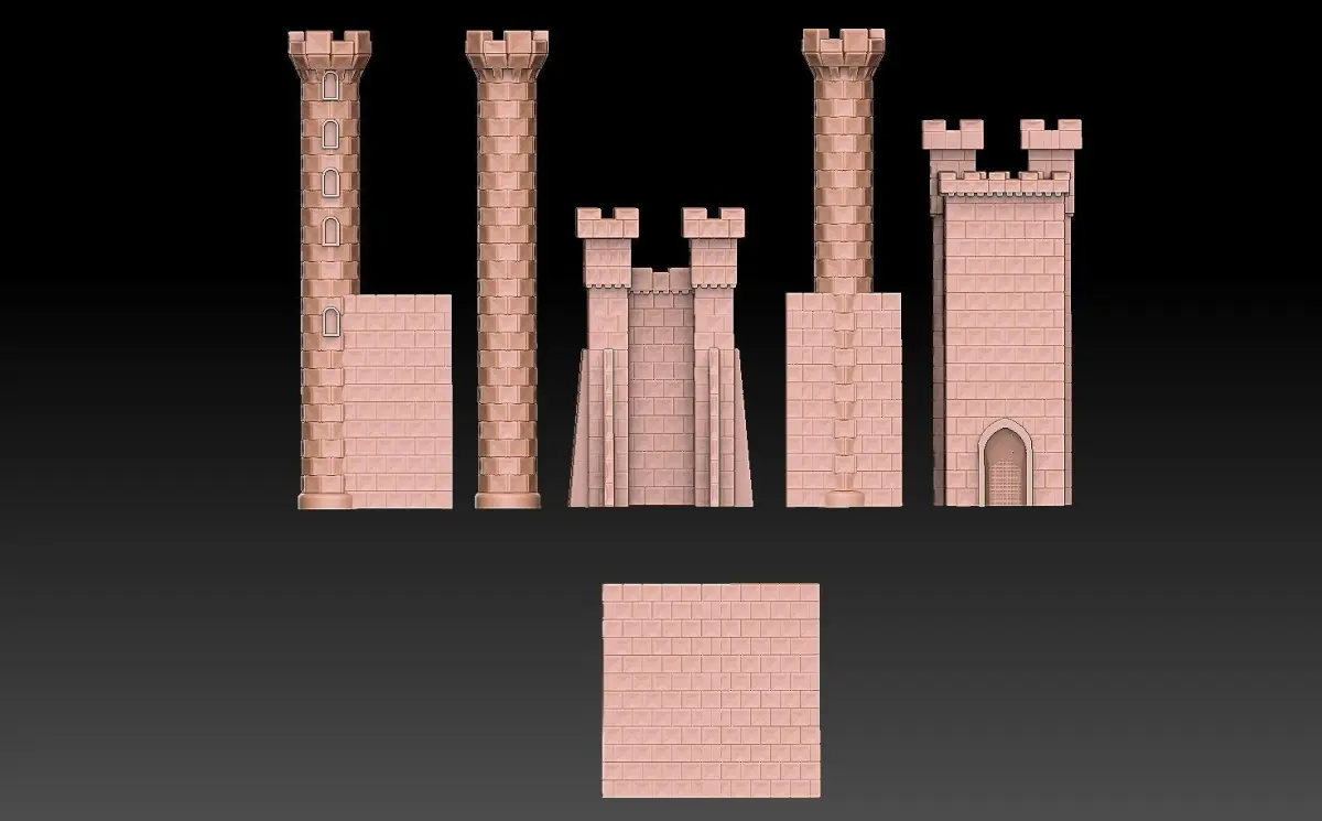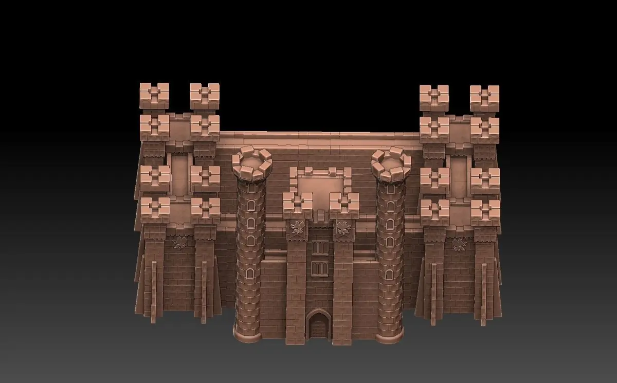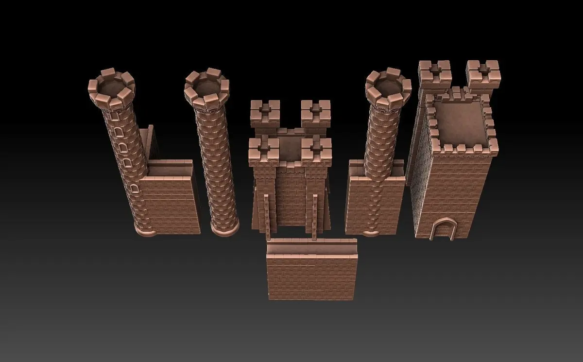 The Castle town from Heroes of Might and Magic 3. This model pack includes both the whole castle as a single-piece model, and its constituent parts as separate models (towers, main gate, wall sections et cetera). The separate model parts CAN be used to build a custom castle with a different layout than the original castle, but this is not a very sophisticated model kit - depending on what kind of layout you decide to try, you may have to cut parts of the walls off prior to printing, to make the model parts fit together. So some basic knowledge of slicer software functions is recommended.