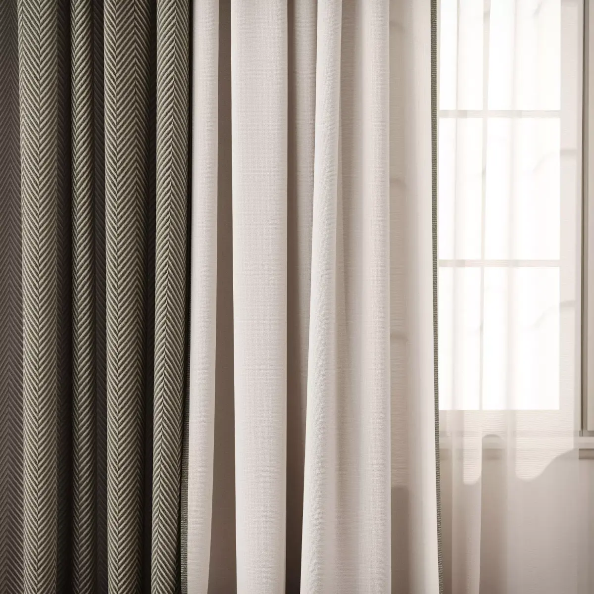 Description:A refined curtain set featuring deep herringbone-patterned side panels paired with smooth beige drapery. Decorative dark trim lines run along the edges for a high-end, tailored look. The sheer backing softens incoming light and adds a dreamy layer to the scene. This design works beautifully in modern classic, minimal, and luxury interiors.