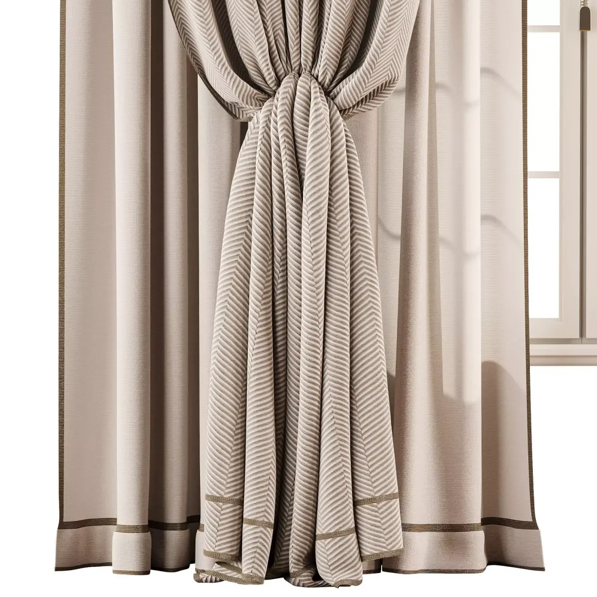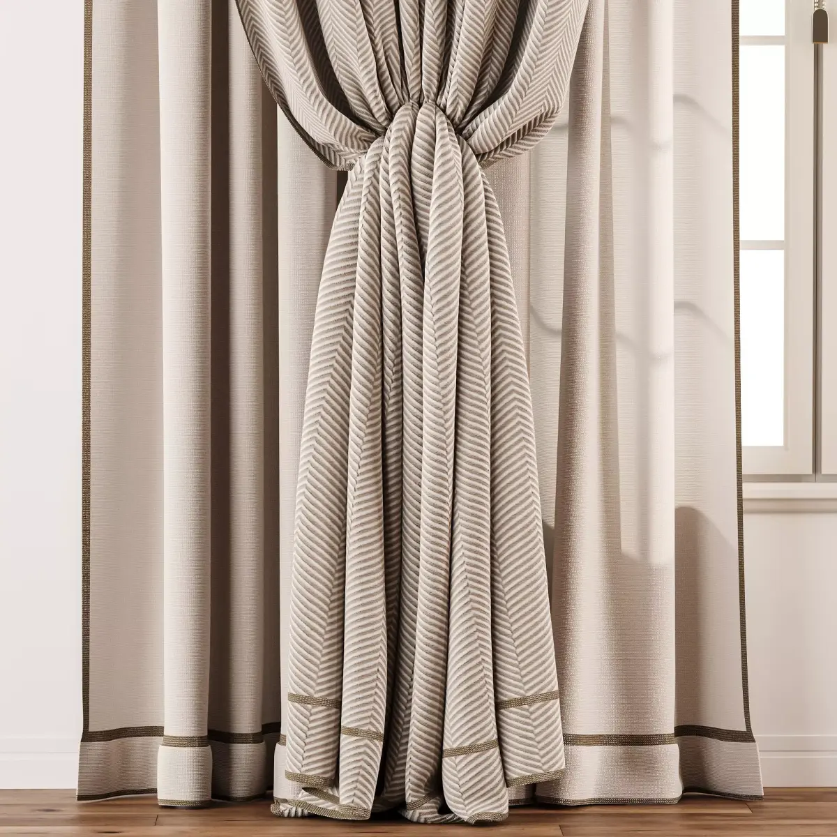 Description:A luxurious curtain set featuring full-length herringbone-patterned linen drapes with elegant dark trim detailing. The set includes a soft sheer layer for light diffusion and a Roman blind in matching fabric for added functionality and realism. This multi-layered design is perfect for refined living spaces, bedrooms, or high-end interior scenes.