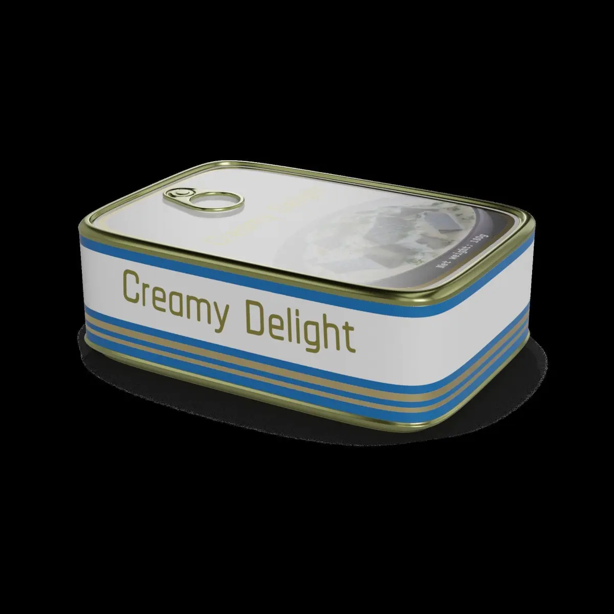 Herring in Cream Sauce: Savor the velvety smoothness of herring fillets in a rich and creamy sauce. The packaging is a rectangular tin can with a luxurious white and gold color scheme. A label with the words Creamy Delight and a graphic of a dollop of cream adds a touch of decadence. Net weight: 180g.