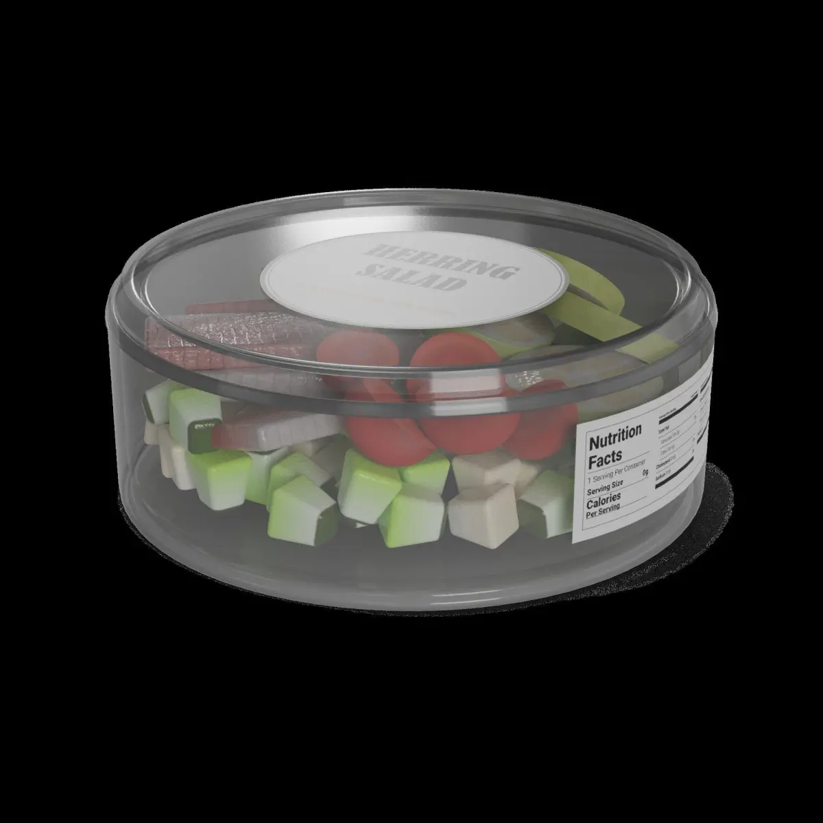 Herring Salad: Dive into a refreshing and flavorful herring salad. Our herring salad is made with tender herring fillets, crisp vegetables, and a tangy dressing. The salad is packaged in a clear plastic container with a vibrant green label, showcasing the colorful ingredients inside. Each container contains 300g of delicious herring salad, perfect for a light and healthy meal.
