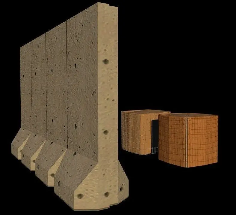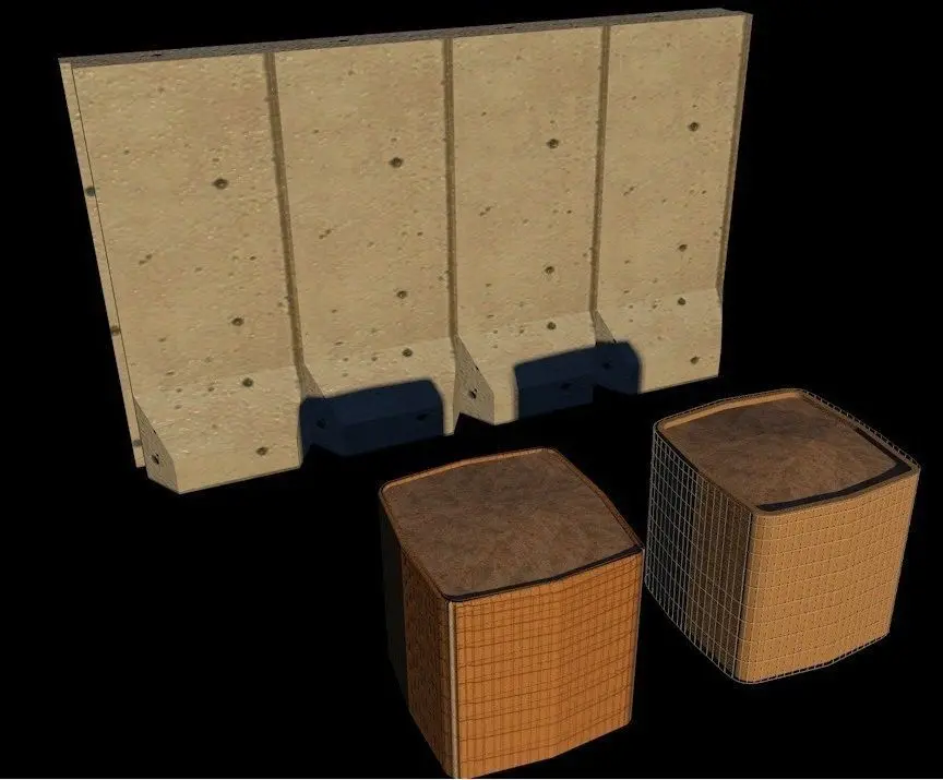 Barriers are a part of life in the US and overseas for our military. This product contains 4 files, 1 simplified Hesco Barrier for fast rendering, 1 detailed Hesco with wire mesh, a set of 4 T-Walls, and a set of 4 Bunkers commonly used for barricading and protection on a military installation.
