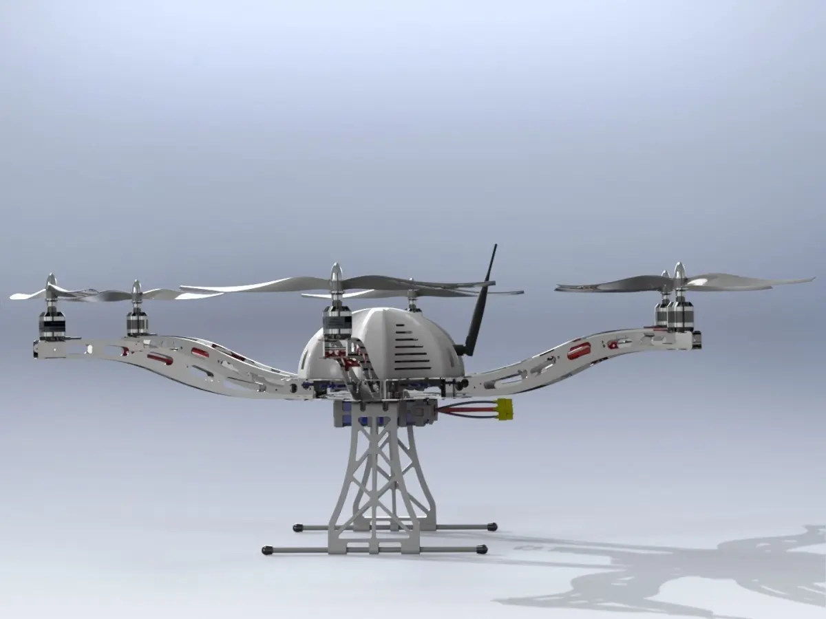 This is a real model of hexacopter which was build using Aluminum sheet. All sheets has been cut using laser cutting machine.The cover and legs were 3d printed.The sheet which hold the motor were designed to hold specific motor, therefore if you're looking to make the same design you should modify the design dimension of the holes in the sheet metal following the data sheet of provided with the motor.