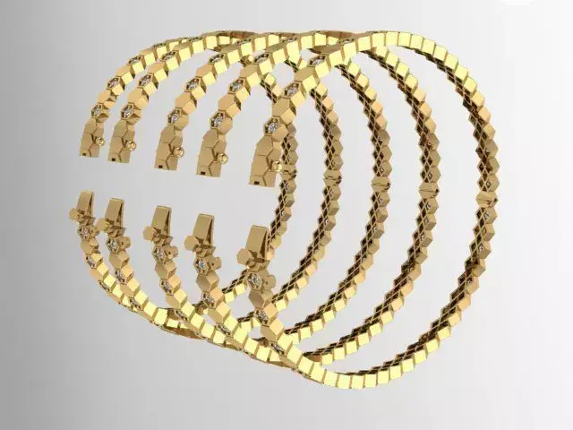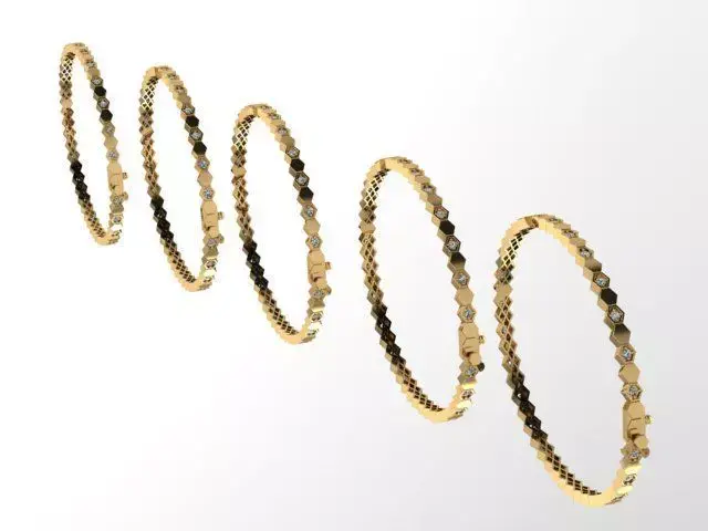 This is a high-quality 3D model of a hexagon-pattern gold bangle set, designed with precision and clean topology.The bangles feature geometric hexagon links with embedded small diamonds, giving a luxurious and modern aesthetic.The pack includes 5 different sizes to fit various design needs: 55, 59, 60, 62, and 63 mm.Model details:
