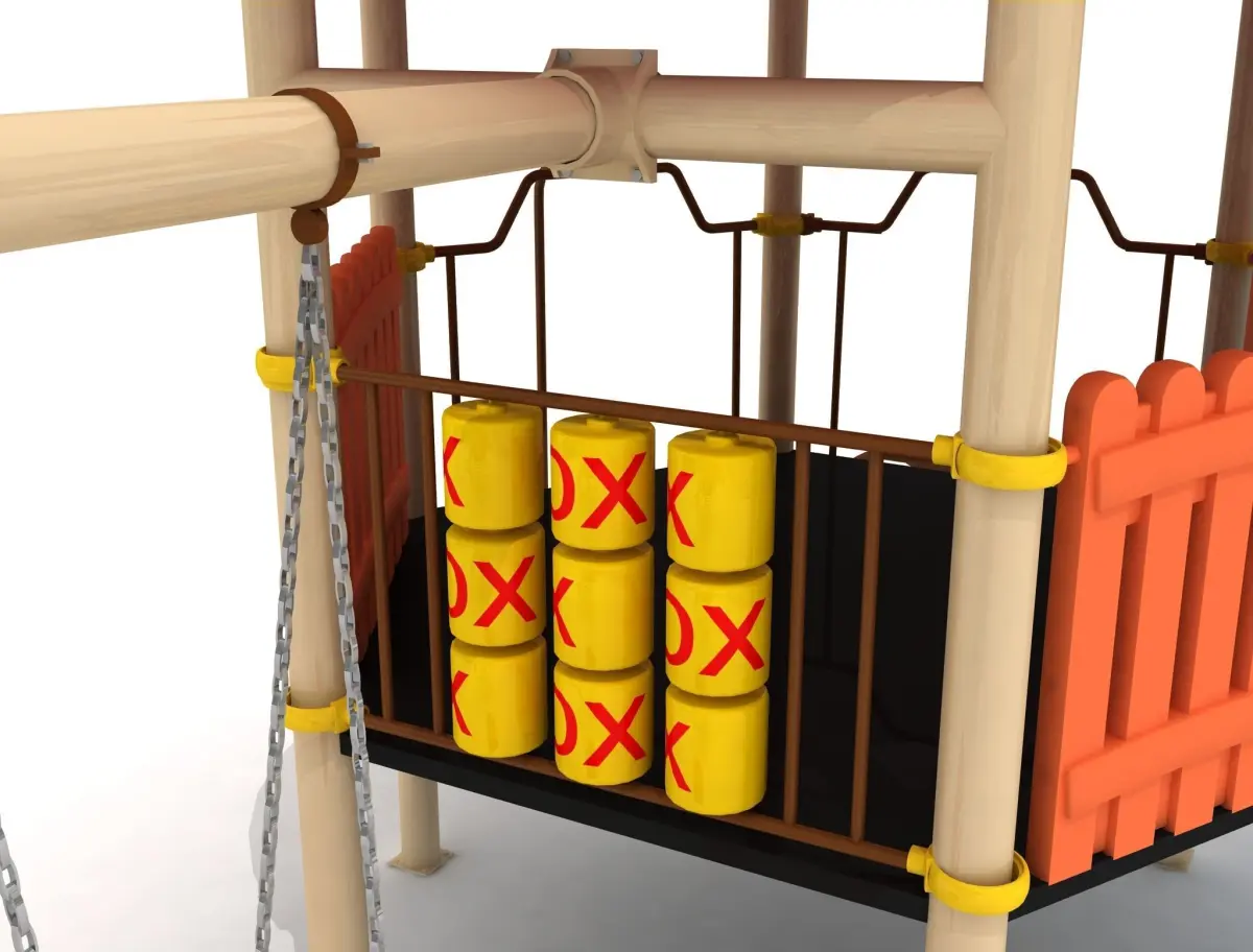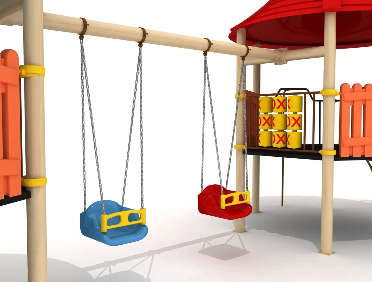 Hexagon rubber platformRubber stairsMountainer climberTube slide (h150)Slide (h150) *Metal pipe *Two modul swings *Polythene handrail *Polythene roofTic tac toe panel *Arc climber *Fireman climber