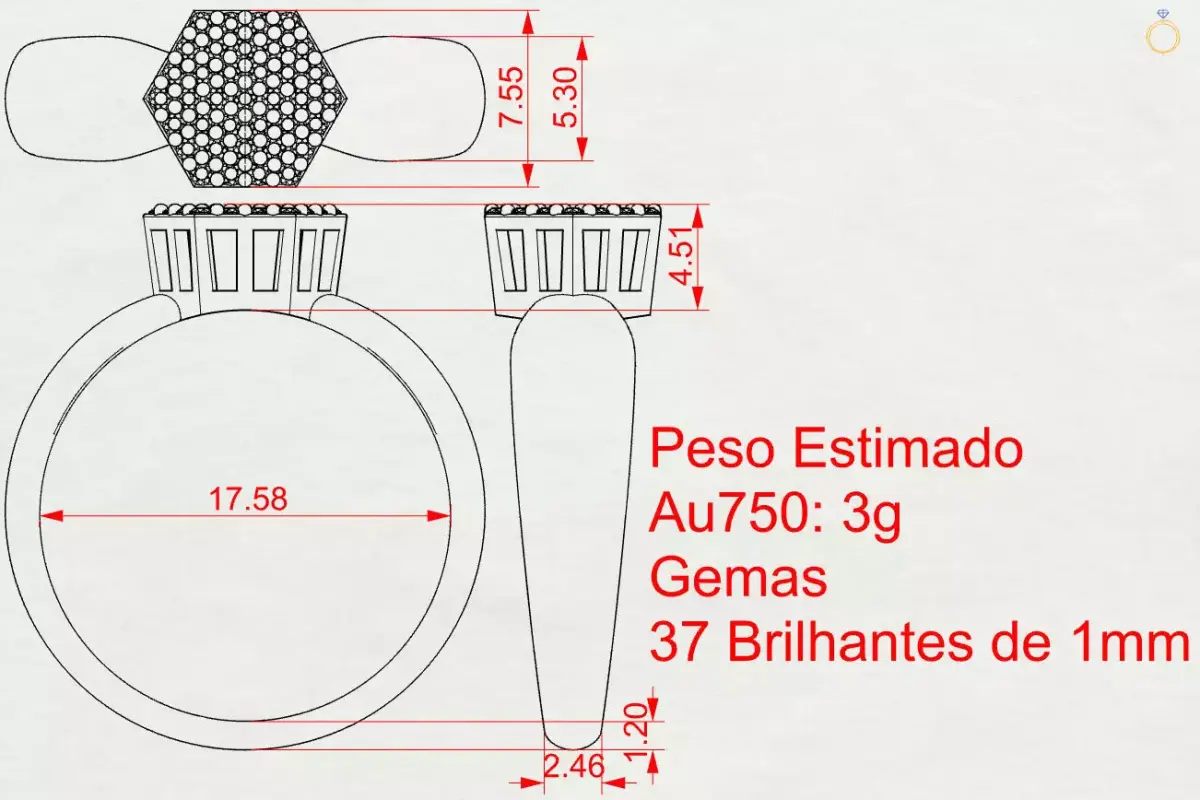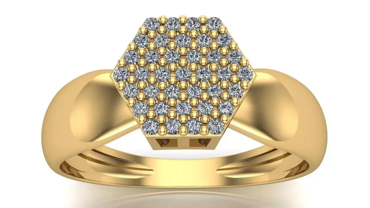 Hexagonal Ring with 37 Brilliant Stones.Cluster ring with a hexagonal top, set with 37 brilliant-cut stones of 1 mm in a pavé setting.Estimated weight: 3 g in Au750 (18K).All measurements of the piece are shown in the image in millimeters.