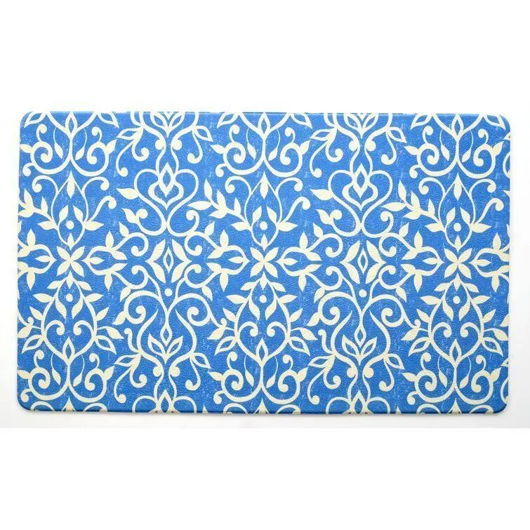 - Place this colorful blue and white mat under your feet while you're chopping veggies or washing dishes. Made from PVC foam, this stain-resistant design provides an anti-slip backing helps you on tile or hardwood floors.