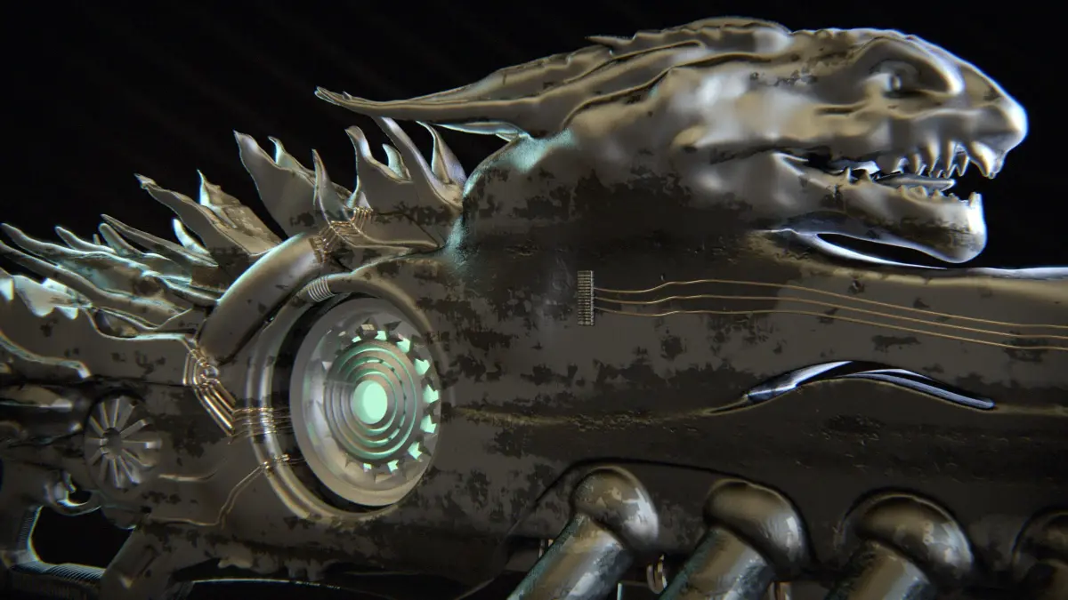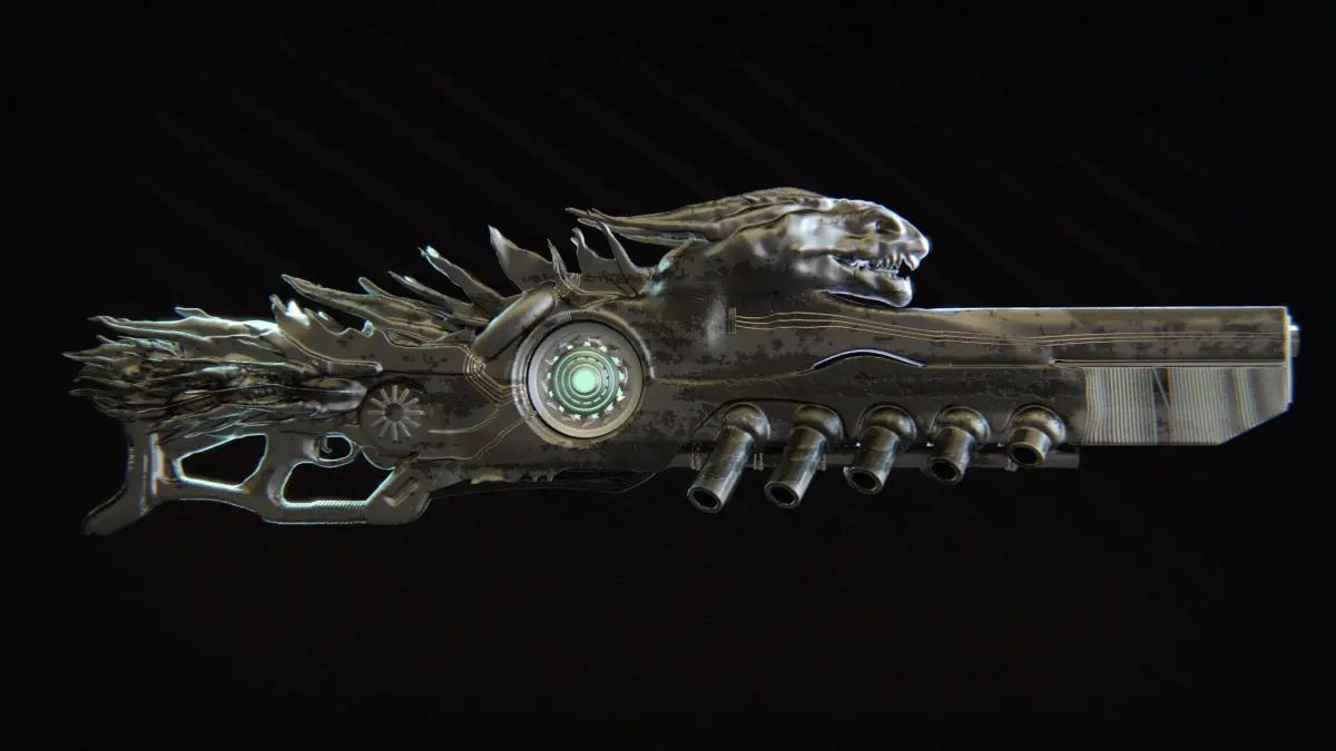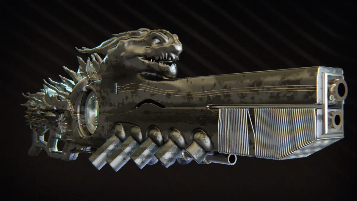 Aged Metal: The main body is crafted from brushed and weathered metal, exhibiting realistic wear and tear for authenticity. Scratches and blemishes give it a battle-worn aesthetic. Luminescent Elements: The energy core and wire-like conduits emit a subtle glow, achieved through emissive materials, providing a contrast to the dark metallic surface. Polished Chrome Accents: The barrels and fine details are rendered in polished chrome, enhancing the model's premium look and feel. Organic Details: The dragon's head and spine are rendered in a metallic texture but maintain an organic appearance through intricate sculpting and detailing.