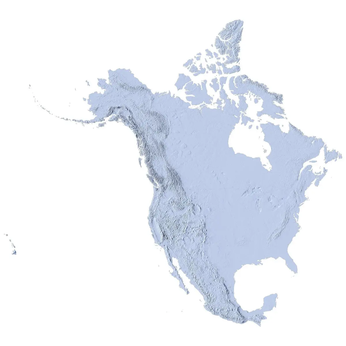The set includes three countries of North America. Each country is represented by a separate model with its own texture. The US model includes Alaska and Hawaii. A Lamberts Conformal Conic projection was used with 500 m resolution. High detailed natural texture have resolution up to 10k x 10k pixels. The height of the relief is increased 5 times (exclude STL files). For comfortable work with the full model set with 3D Max recommended at least 8 GB of RAM, with Maya - 16 GB of RAM. Also recommended is a graphics card with at least 3 GB of RAM