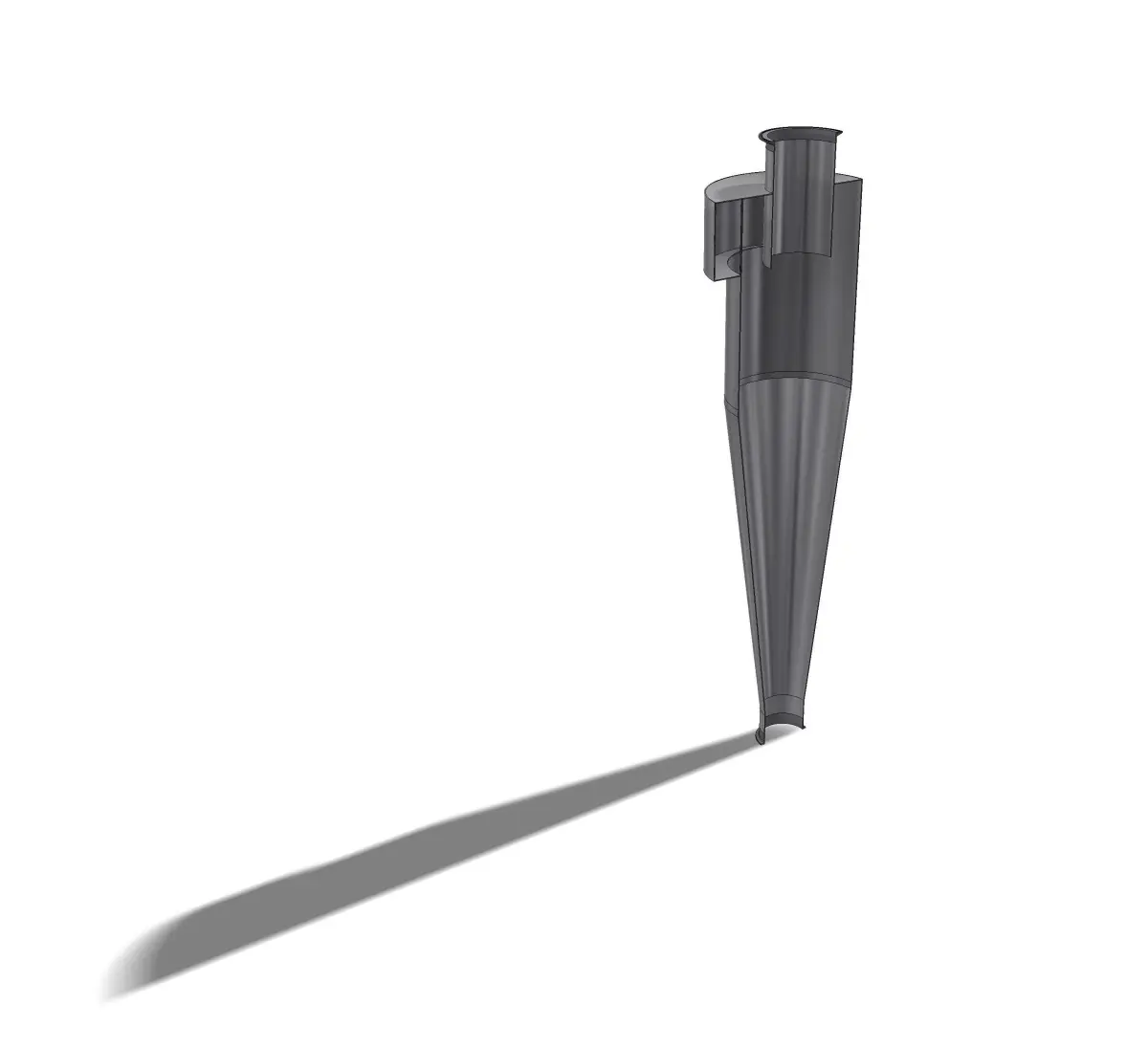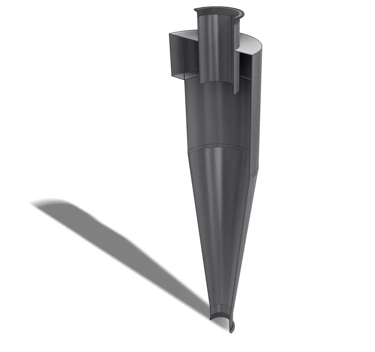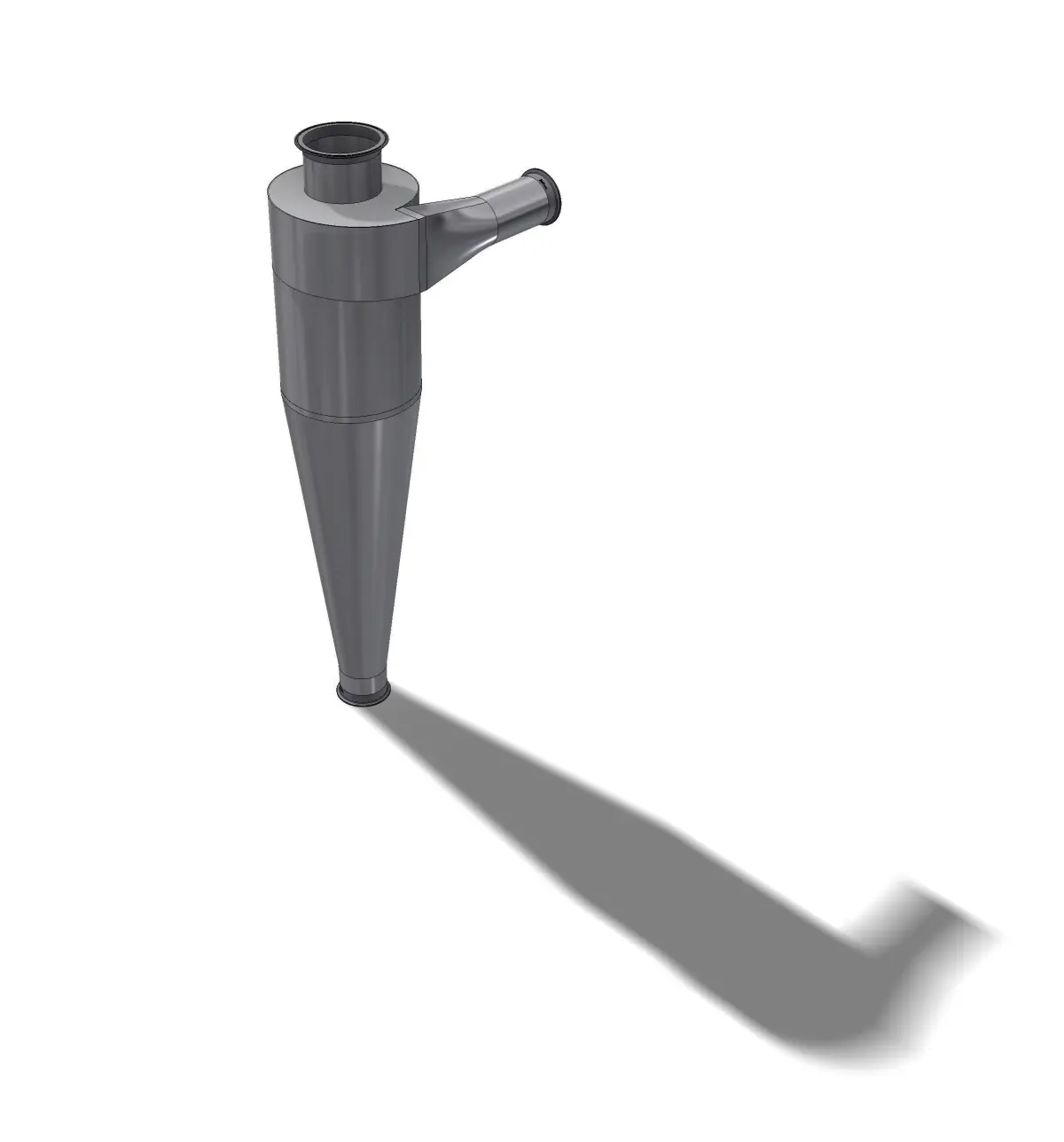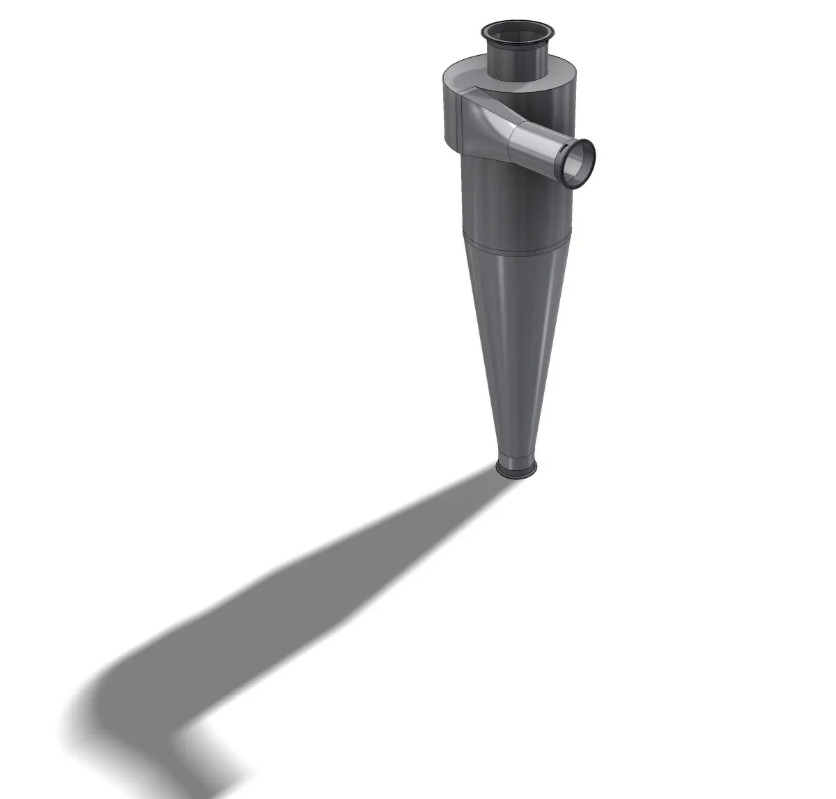 Español...Modelo 3D, con plano de fabricación, de ciclón separador de sólidos para línea de transporte neumático en la industria alimentaria o farmacéutica. El material del diseño es acero inoxidable AISI316L con conexiones comerciales higiénicas tipo clamp.Especificaciones técnicas para un funcionamiento óptimo:• Diámetro de ciclón: 300mm• Caudal de gas: 11,8 m3/min• Tamaño de tubería de entrada: DN100• Velocidad del gas en la tubería de entrada: 25,0 m/s• Tipo de ciclón: alta eficiencia Stairmand AE Ø300• Velocidad de entrada: 21,8 m/s• Velocidad de salida: 11,1 m/s• ∆P Ciclón: 155 mmH2O