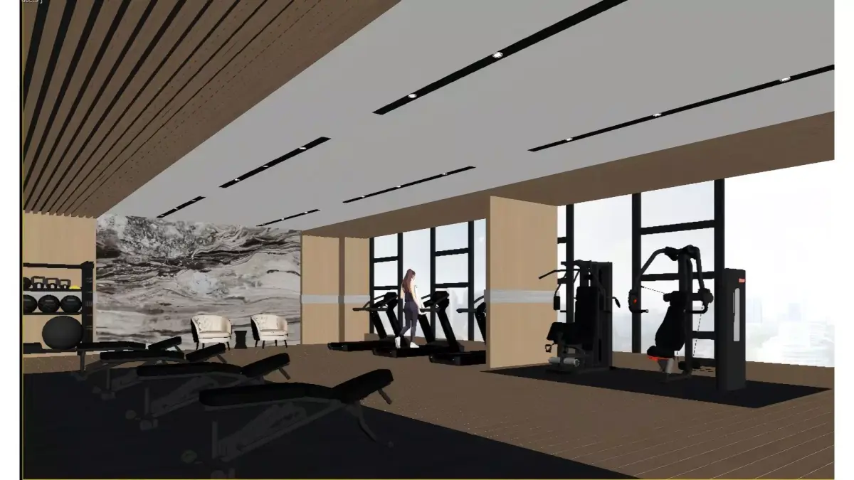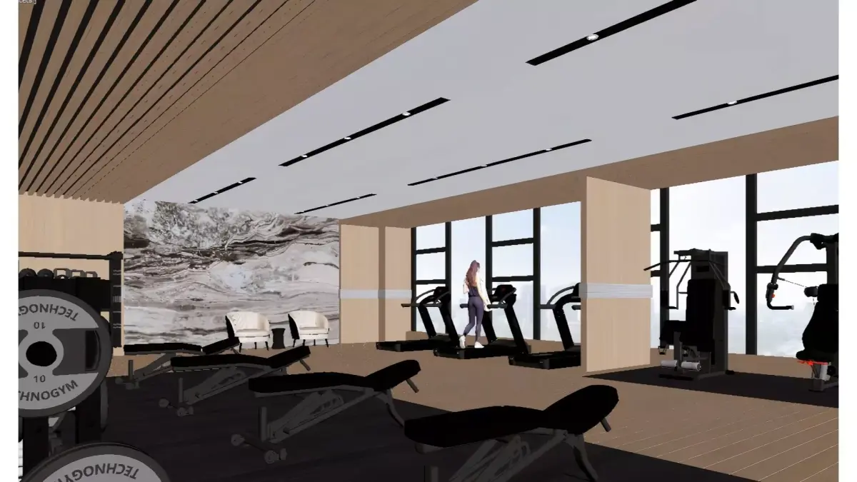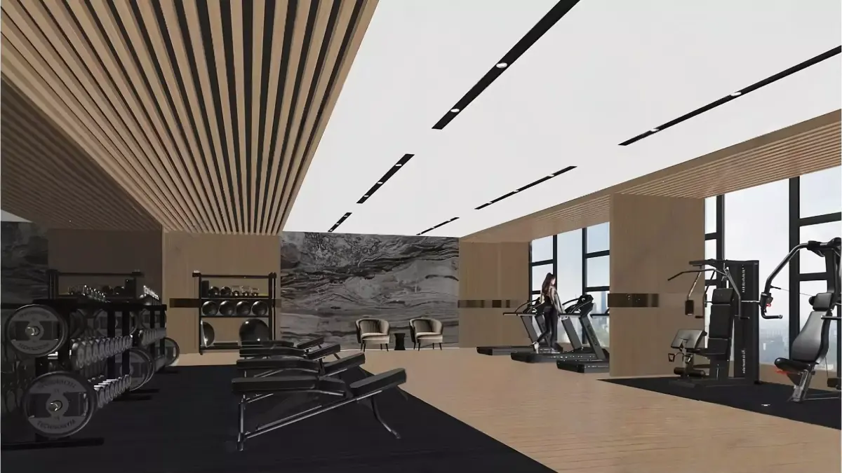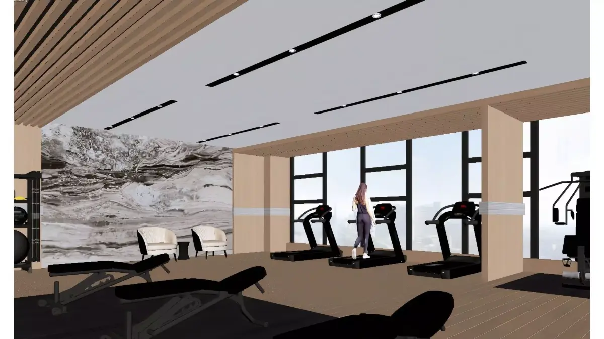 This is a high-end gym with a modern light luxury style. It features a suspended ceiling with wooden slats, marble-patterned walls, and full-panoramic floor-to-ceiling windows, creating a spacious and bright sense of space. Equipped with professional fitness equipment such as Technogym, it combines functionality with aesthetic design. The overall atmosphere is comfortable and sophisticated, making it suitable for high-quality fitness needs.