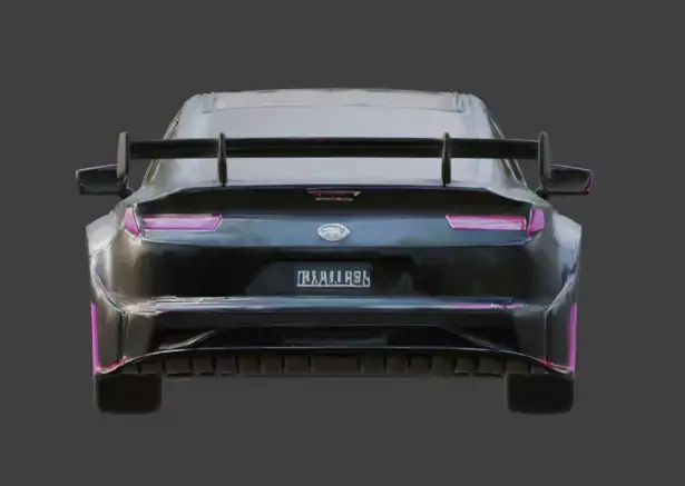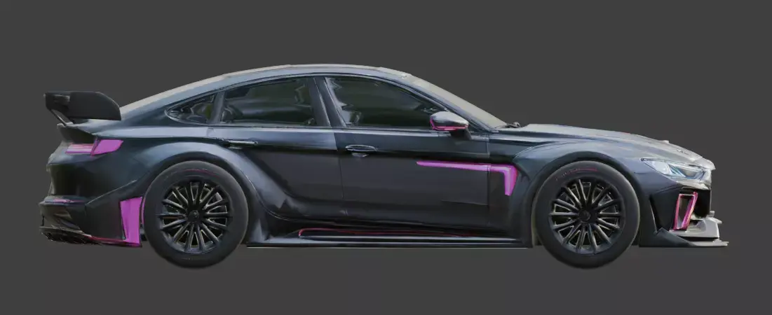 Tagssports sedan, performance car, tuned vehicle, 3D model, neon lighting, GT wing, aerodynamic kit, carbon fiber, high-fidelity, racing asset