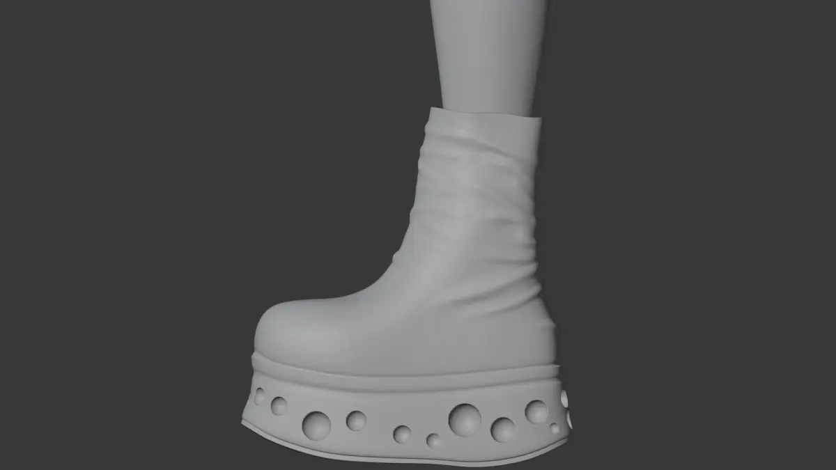 - I recommend using a HDRI for optimal results, polyhaven has nice ones, but the default forest HDRI from blender looks ok for visualizing the boots too.-I've sculpted some cloth wrinkles on the boot for more realism and the platform has cheese-like holes.-You can contact me if you have any questions.