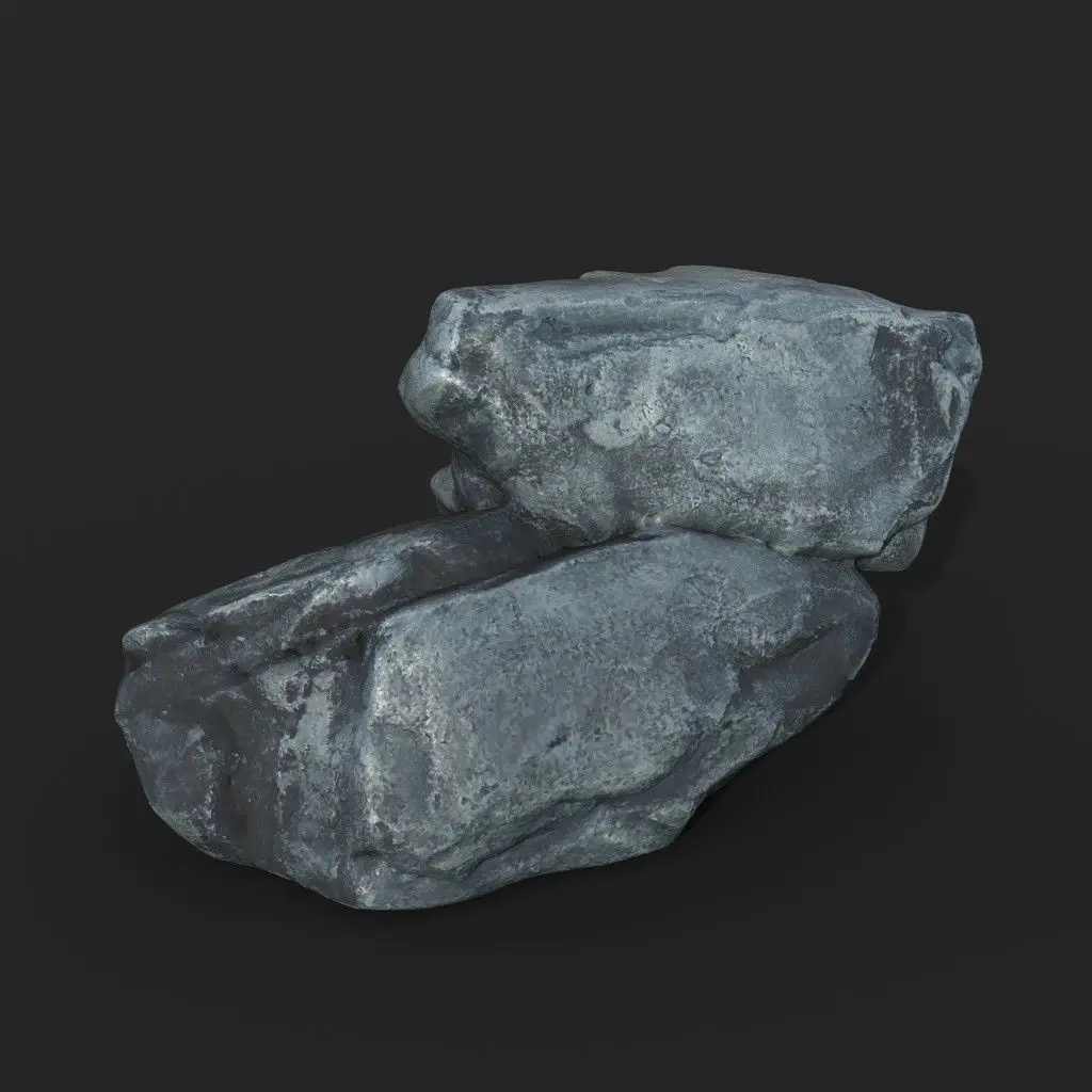This product consists of 8 3D models of rock formations. The shapes are relatively round, with edges worn by weather and environmental factors. These rock shapes are commonly found in geographical features such as coastlines, riverbanks, or streams and waterfalls. The color of the rocks is a blue-grey, with a slightly glossy surface and occasional darker patches caused by dirt or dampness.