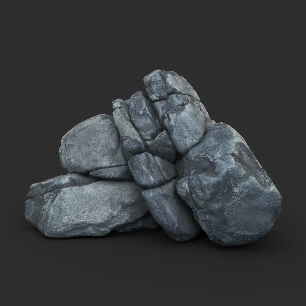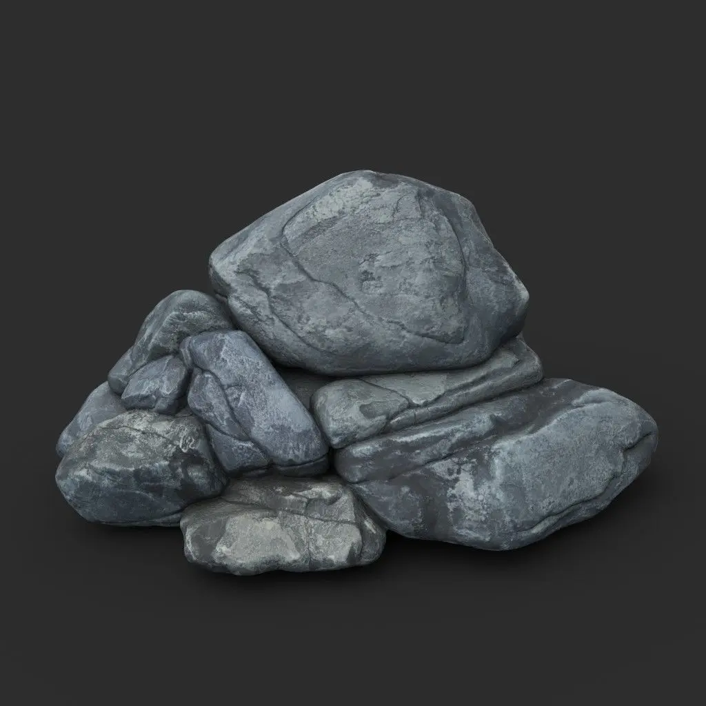 This product consists of 8 3D models of rock formations. The shapes are relatively round, with edges worn by weather and environmental factors. These rock shapes are commonly found in geographical features such as coastlines, riverbanks, or streams and waterfalls. The color of the rocks is a blue-grey, with a slightly glossy surface and occasional darker patches caused by dirt or dampness.