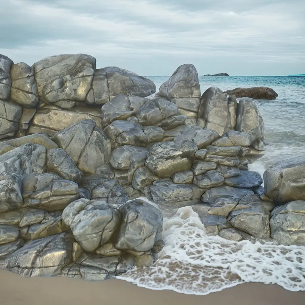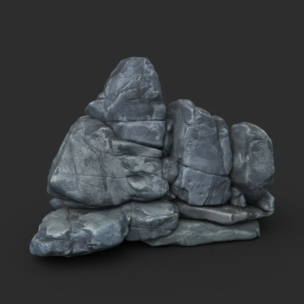 This product consists of 8 3D models of rock formations. The shapes are relatively round, with edges worn by weather and environmental factors. These rock shapes are commonly found in geographical features such as coastlines, riverbanks, or streams and waterfalls. The color of the rocks is a blue-grey, with a slightly glossy surface and occasional darker patches caused by dirt or dampness.