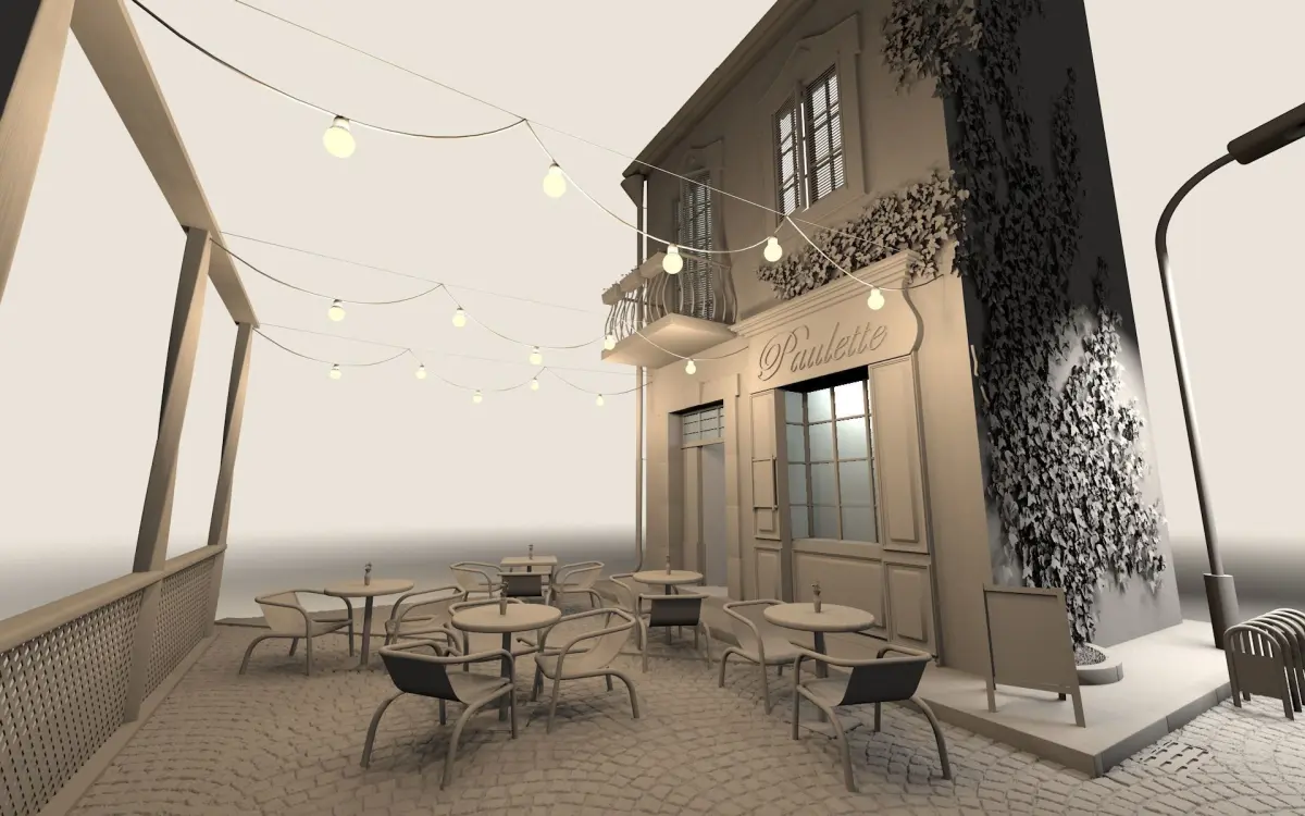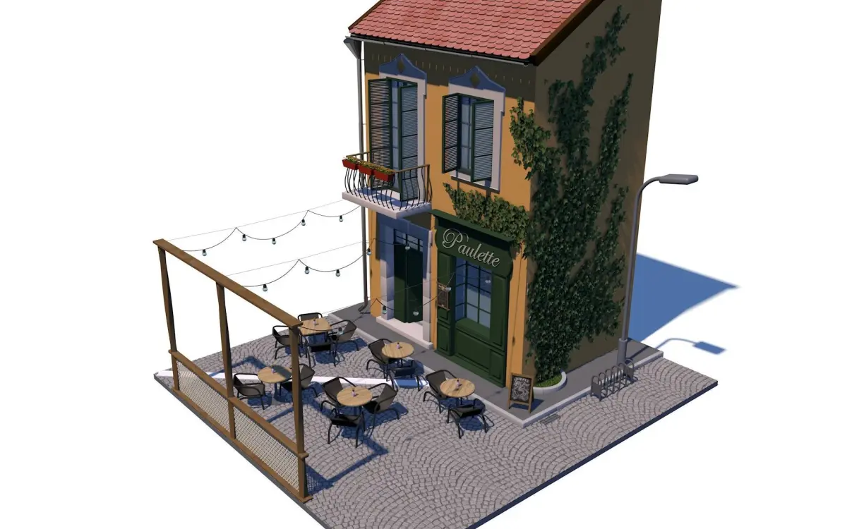Isometric high poly cafe with tables and chairs, outdoor summer playground. European style, narrow street, light bulbs, paving stones, menu sign and coffee advertisement.High poly model, 4K textures present